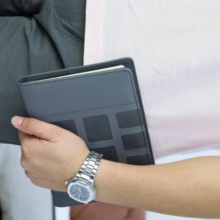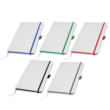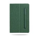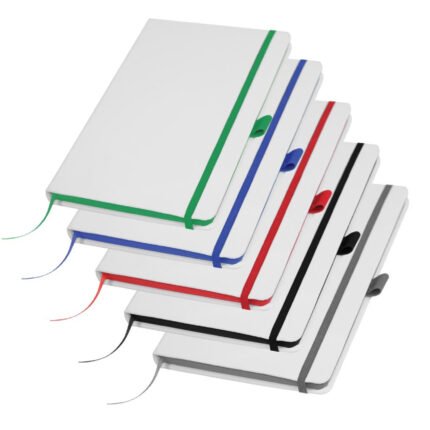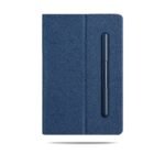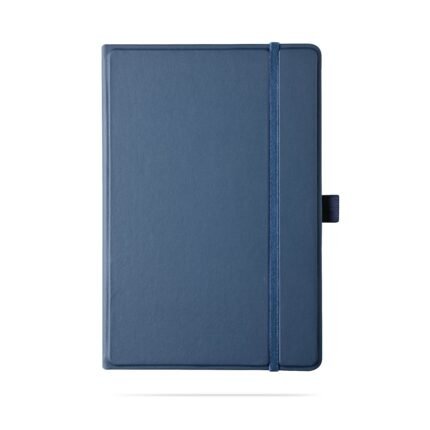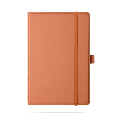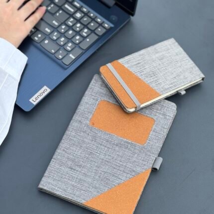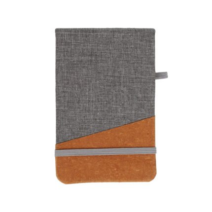 A5 Notebook with 2n1 writing instruments: pen and pencil on the otherside and has elastic for closure in recycled PU Material. Notebook has fold on the cover that serves as a mobile stand. Product Size: 20×14.1×1.5cm. Packaging: Kraft Paper Box