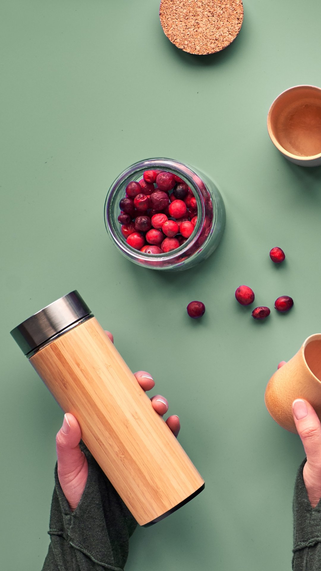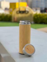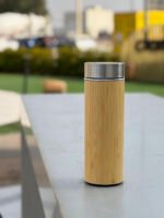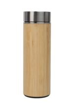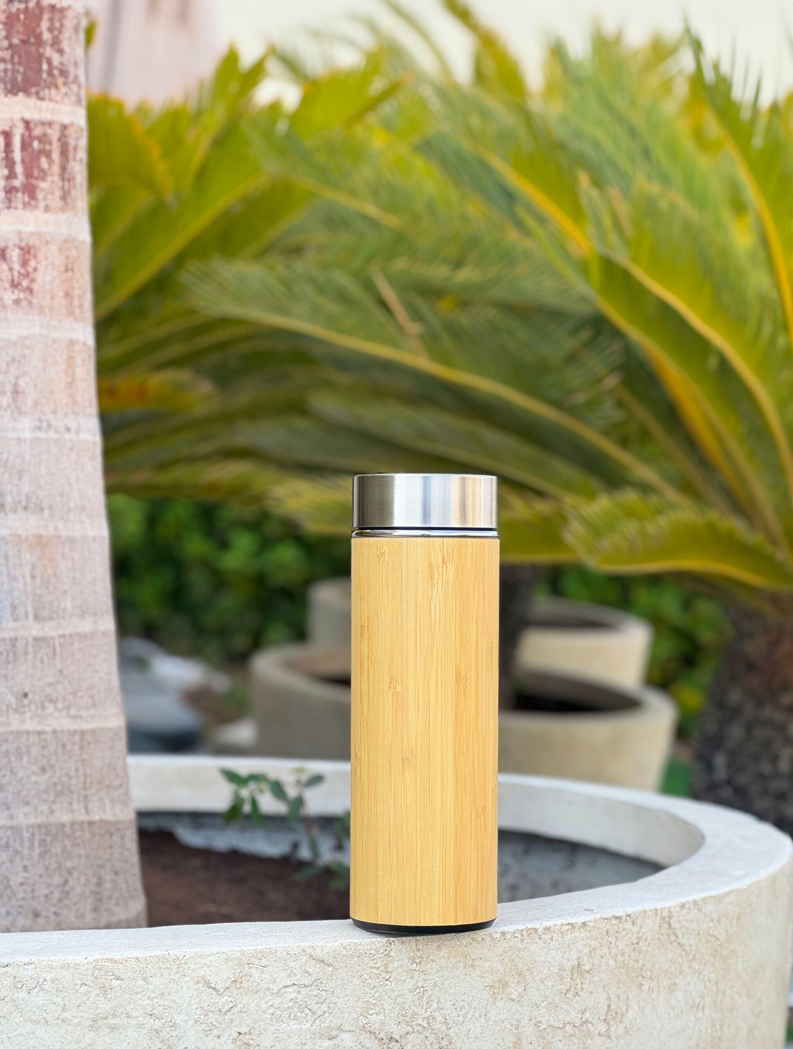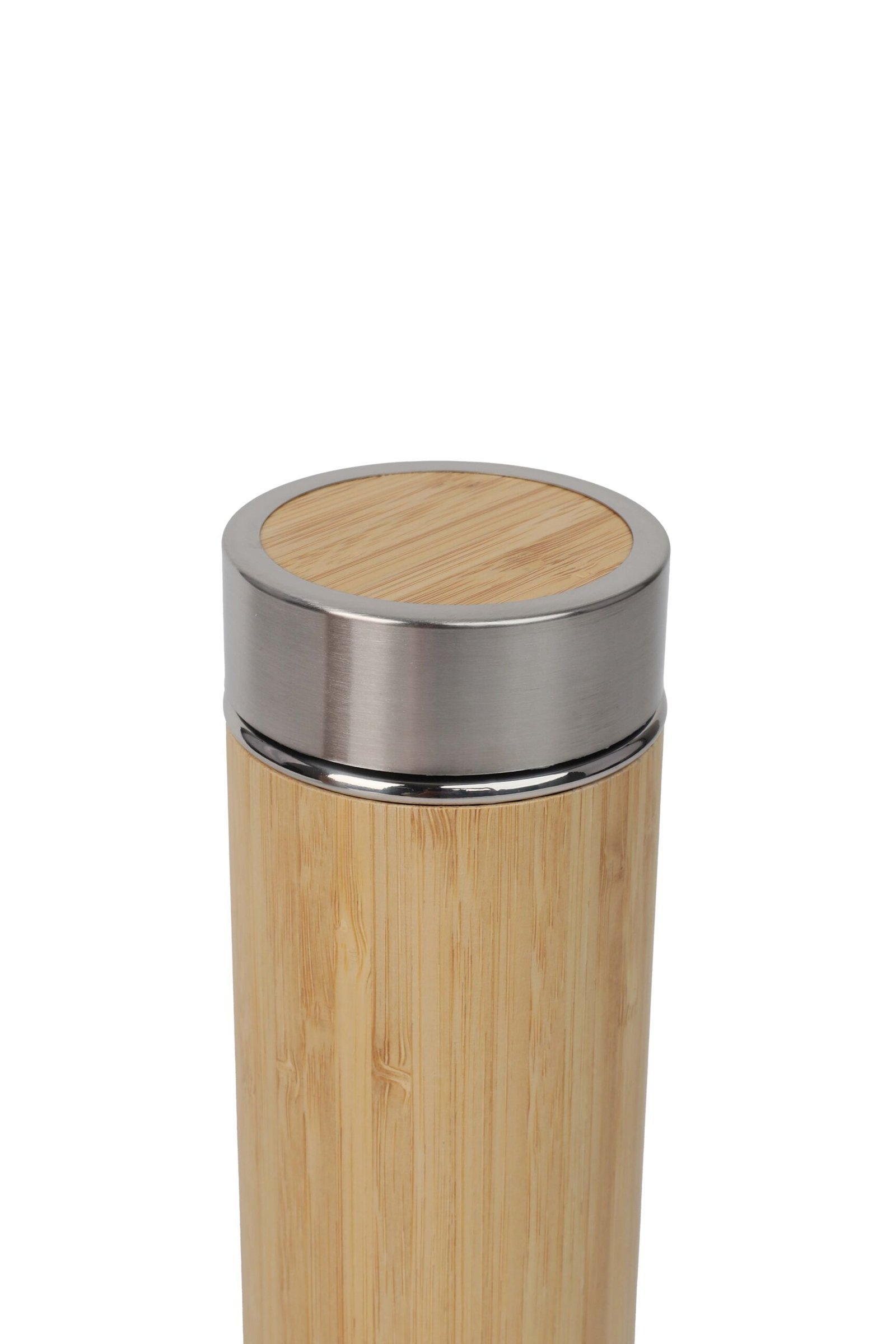 Vacuum stainless steel flask that is wrapped with bamboo exterior. Comes with a bamboo wrapped lid and a tea infuser.