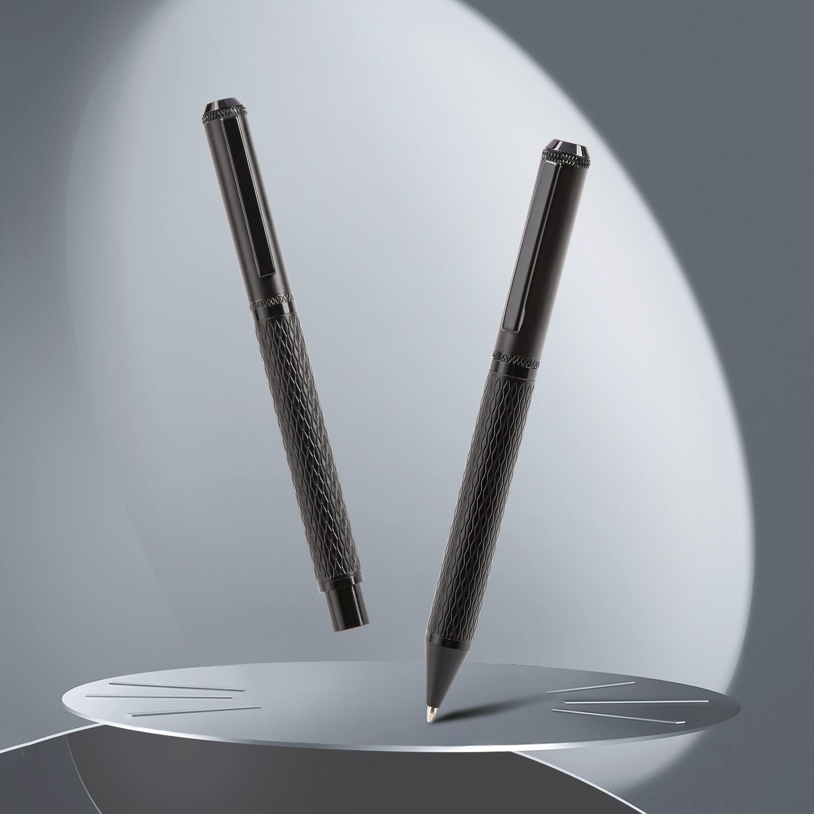 A German made ball ben in blue colour with silver chrome top barrel and detailing and a black under barrel.