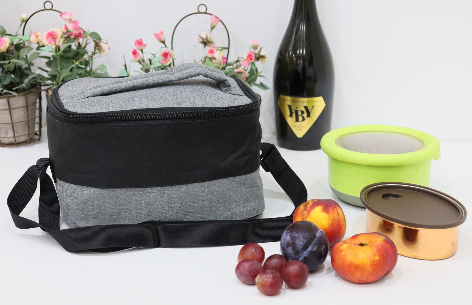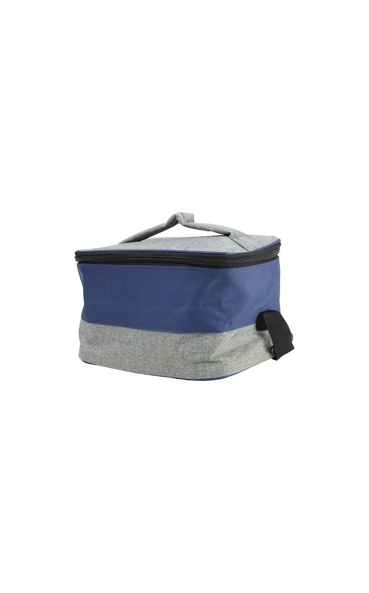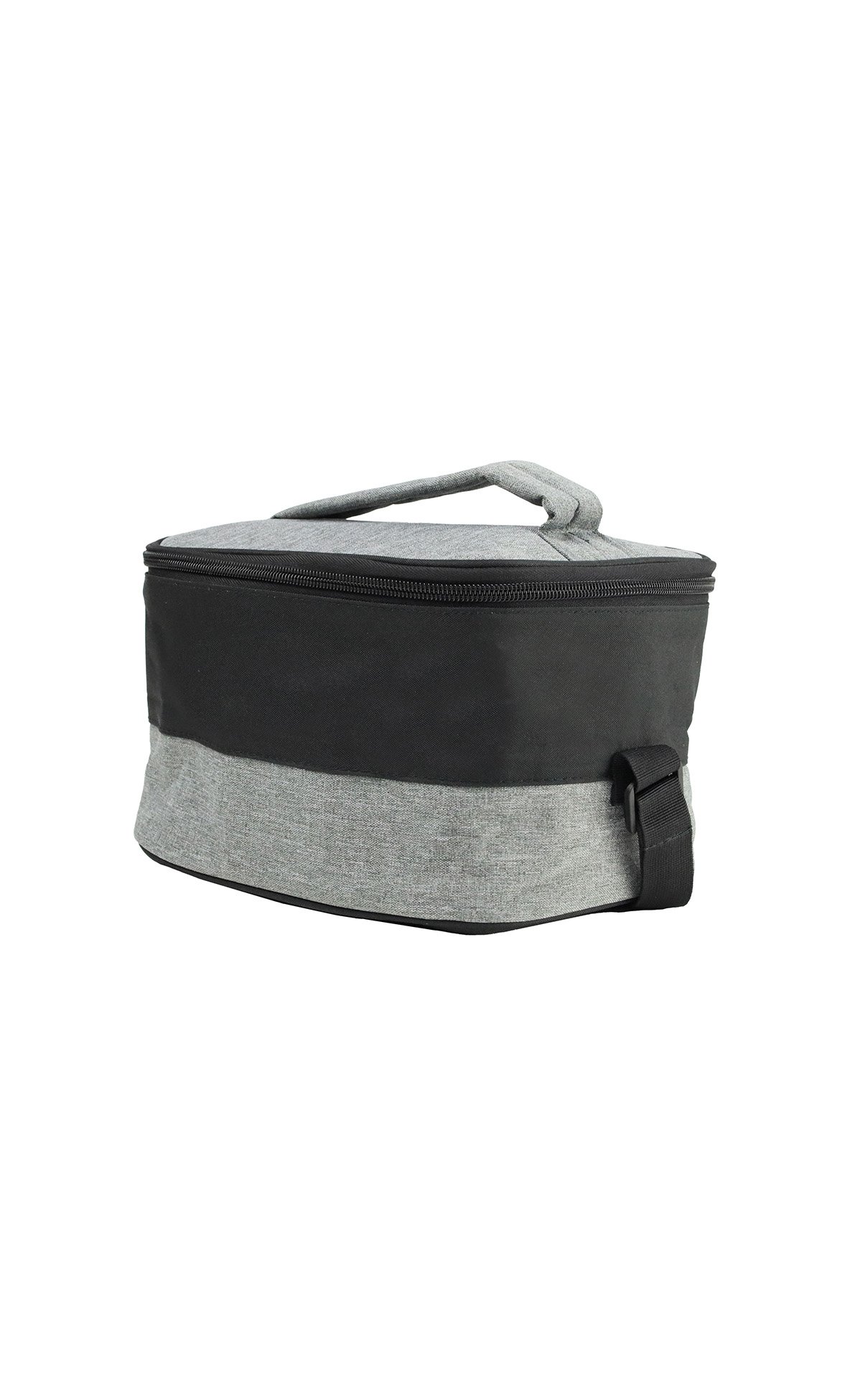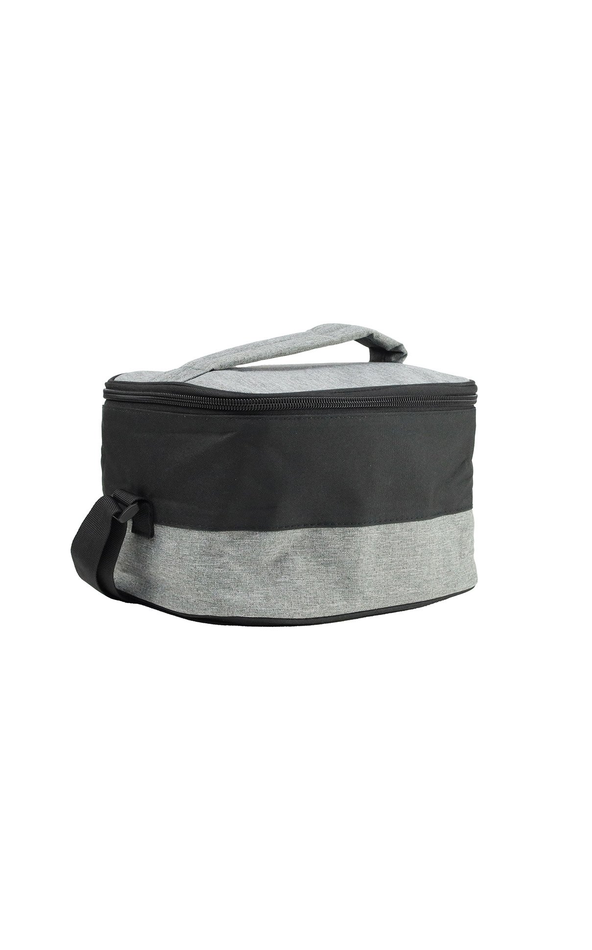 Two-tone, spacious lunch bag made from recycled material – 600D RPET that comes with an insulated layer inside and a shoulder strap.