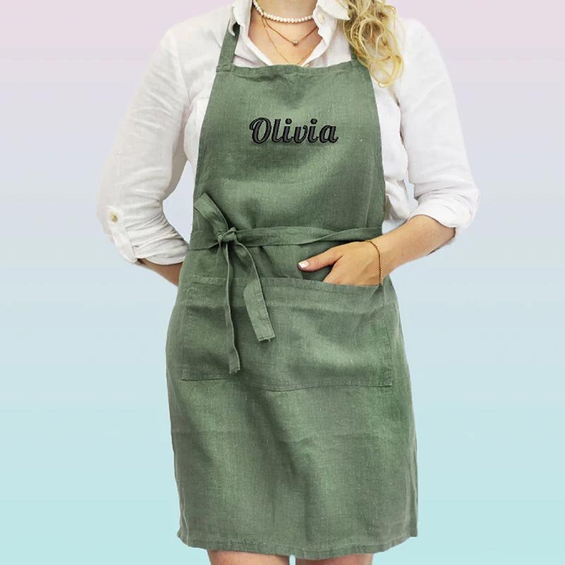 Tailored aprons designed to meet unique fit and style for each user. These aprons can be personalized with various colors,