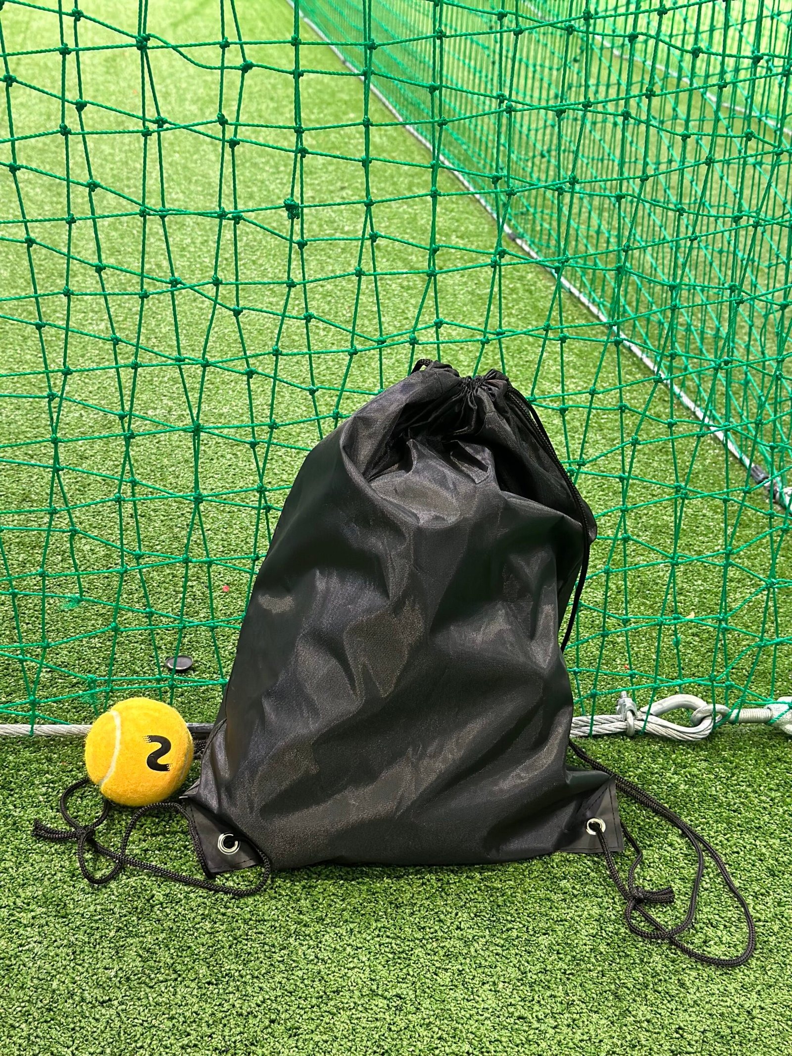 High-strength PVC drawstring bag that is water-resistant and comes with two black strings.