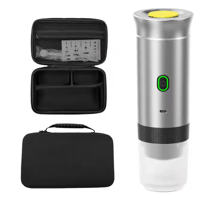 Powered by a built-in 7500mAh rechargeable battery and equipped with a powerful 40 PSI pump, this coffee maker ensures high-quality extraction for rich flavor and crema. The set includes two 80ml espresso cups neatly packed in a travel pouch, making it ideal for travel, office, or outdoor adventures. Compactly sized at 7.79 x 7.79 x 24.55 cm and packaged in an eco-friendly paper box, it’s your perfect companion for coffee anytime, anywhere.