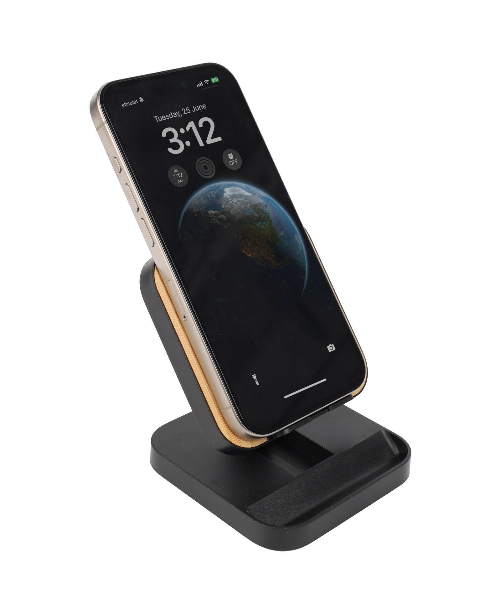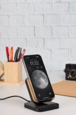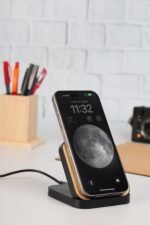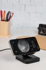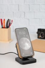 A mobile stand made from recycled ABS plastic and eco-friendly bamboo material with wireless charging properties. Comes with 15W fast charging feature works horizontally & vertically.