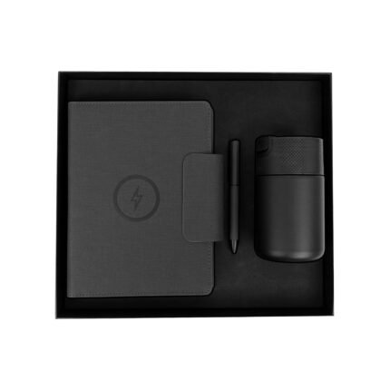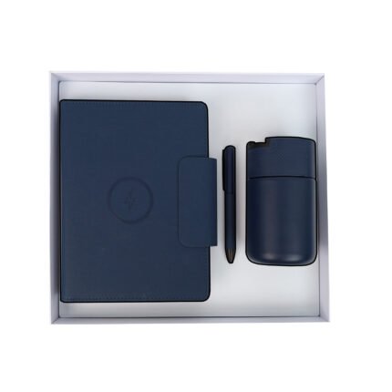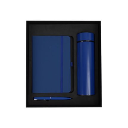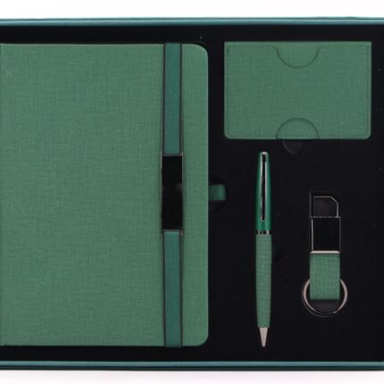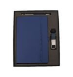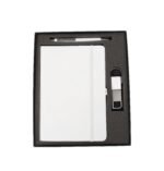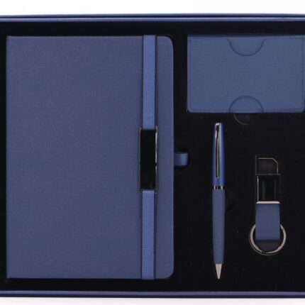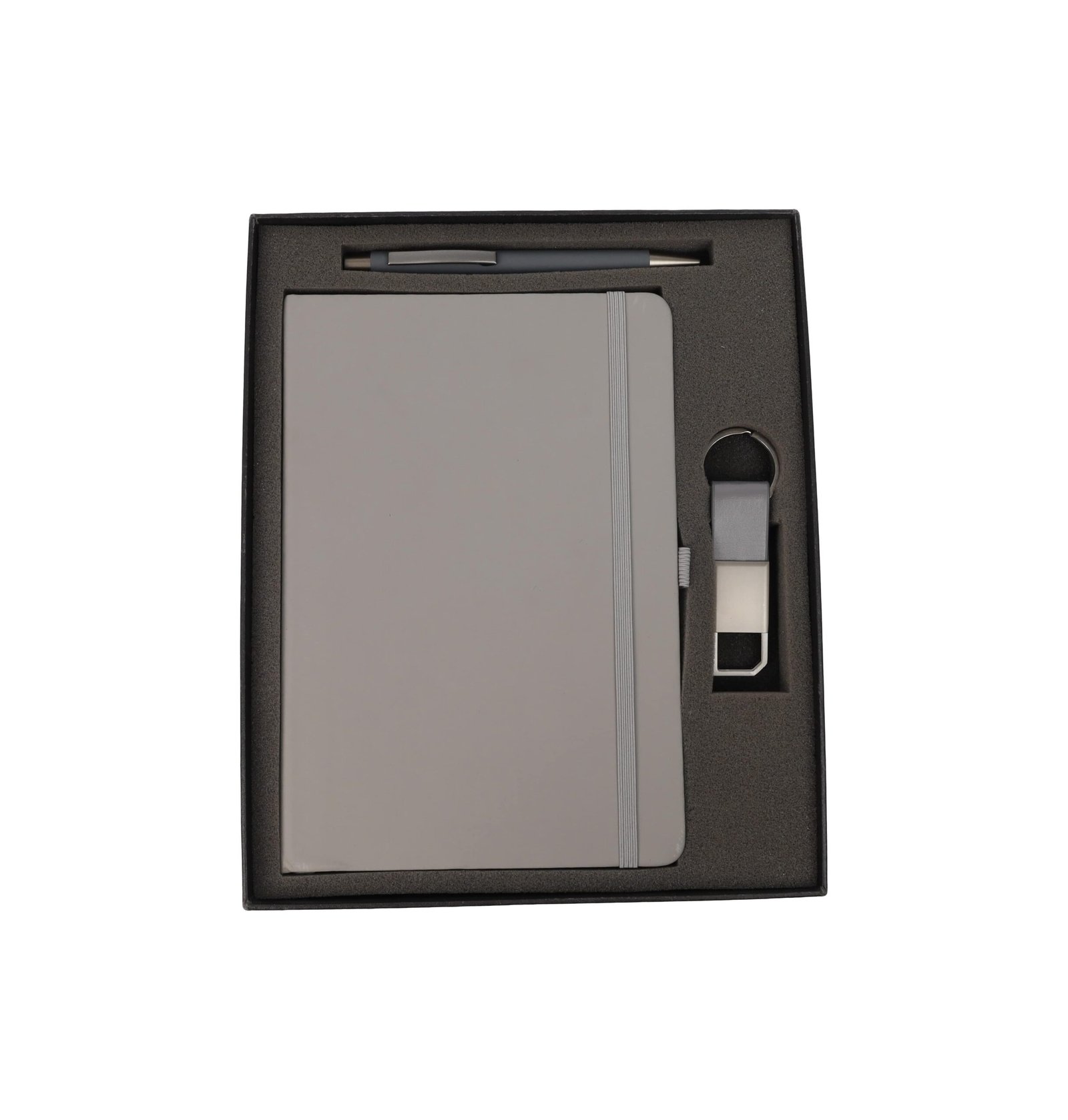 A corporate gift set that consists of a gift box with foam cut. This gift box features an A5 notebook a pen & a keychain.
