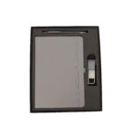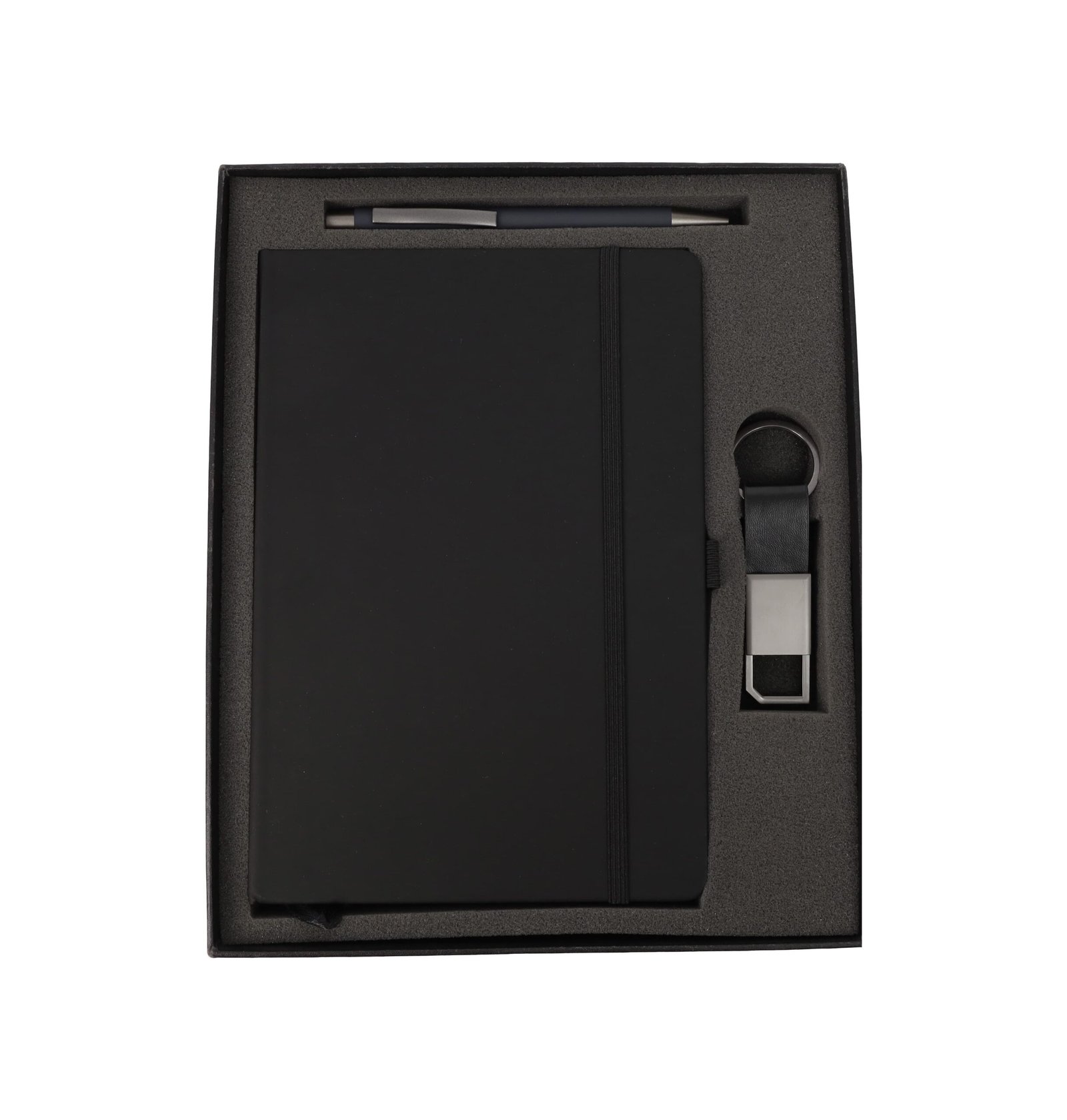 A corporate gift set that consists of a gift box with foam cut. This gift box features an A5 noteboo. a pen & a keychain.
