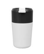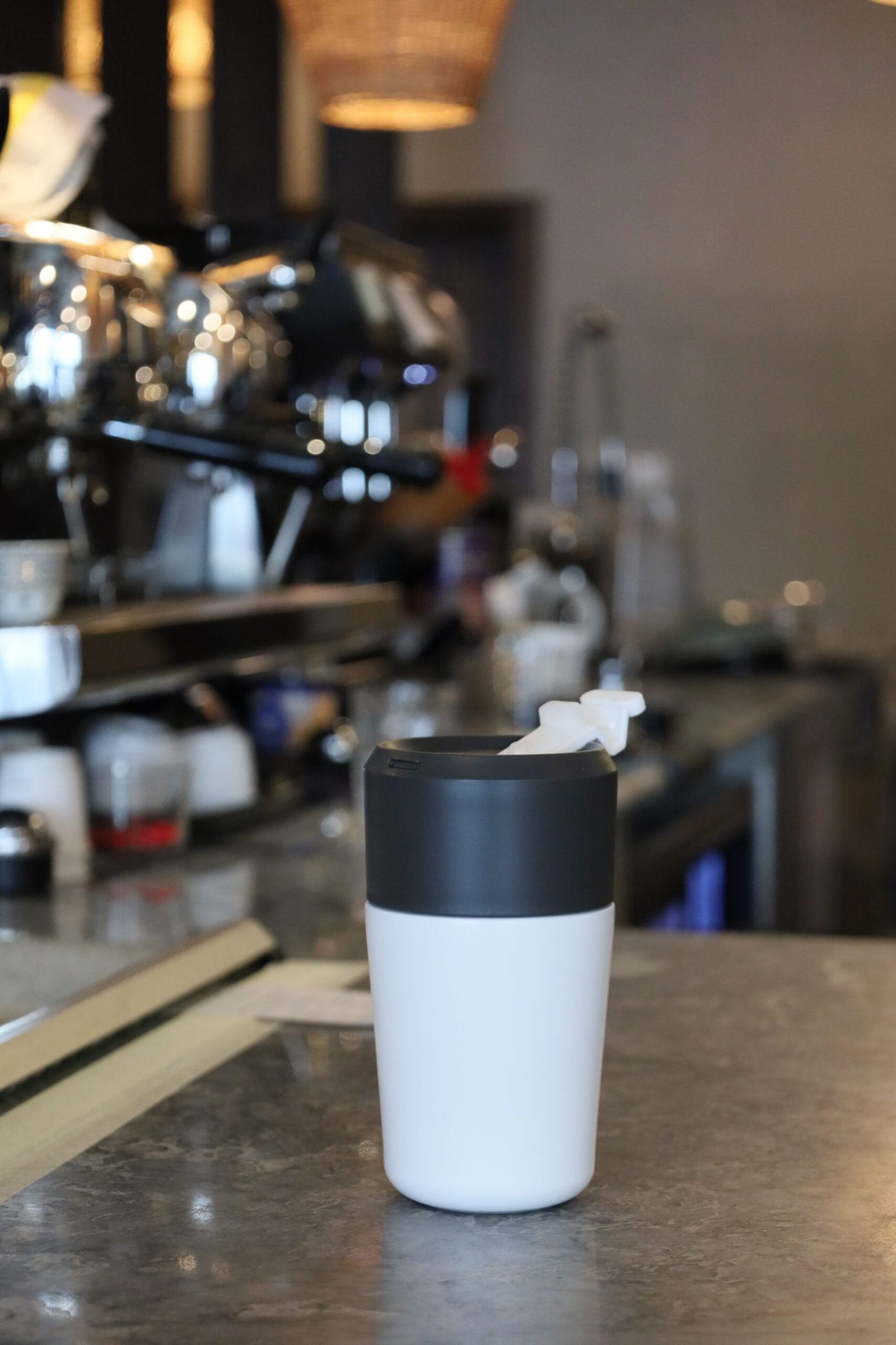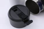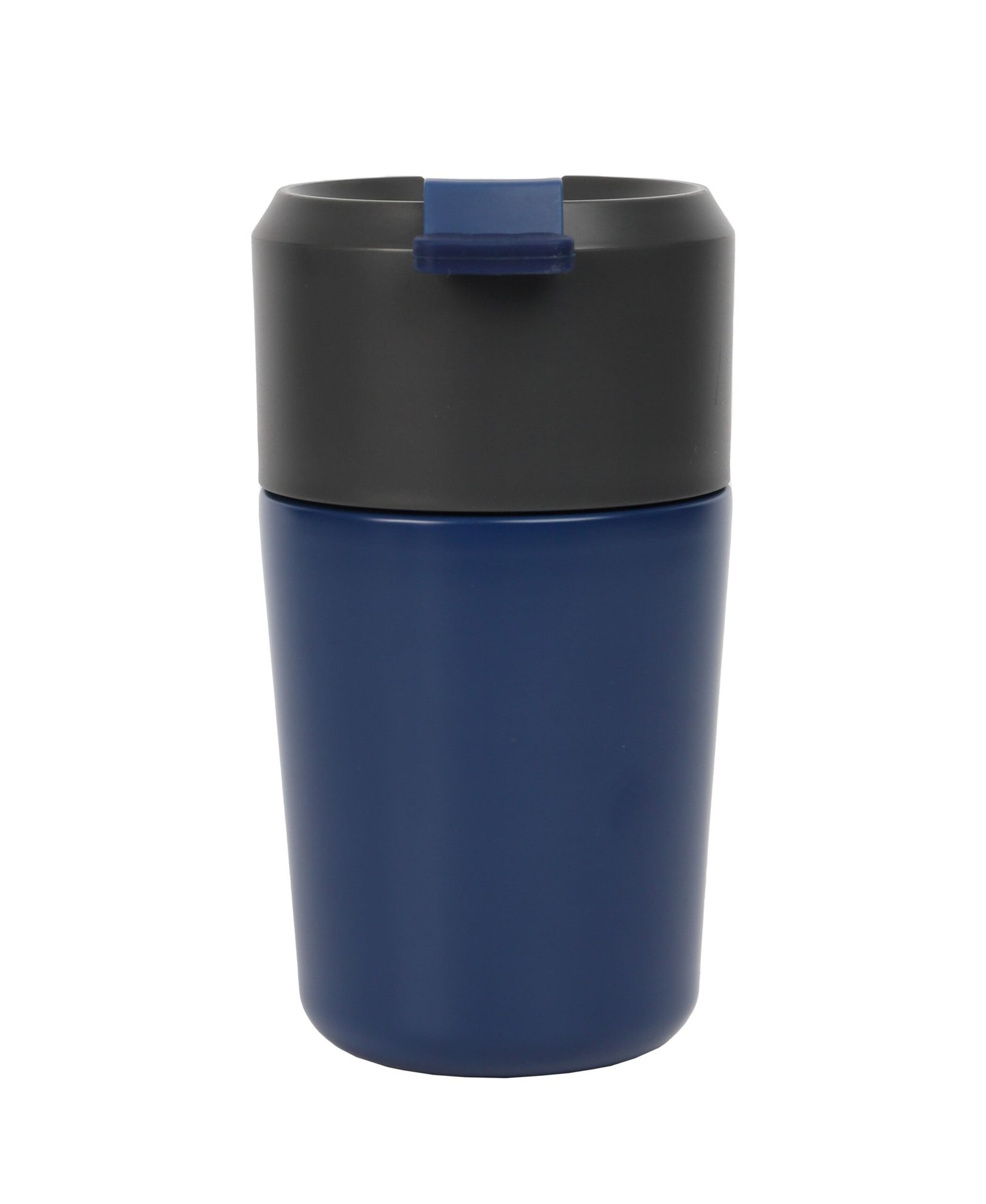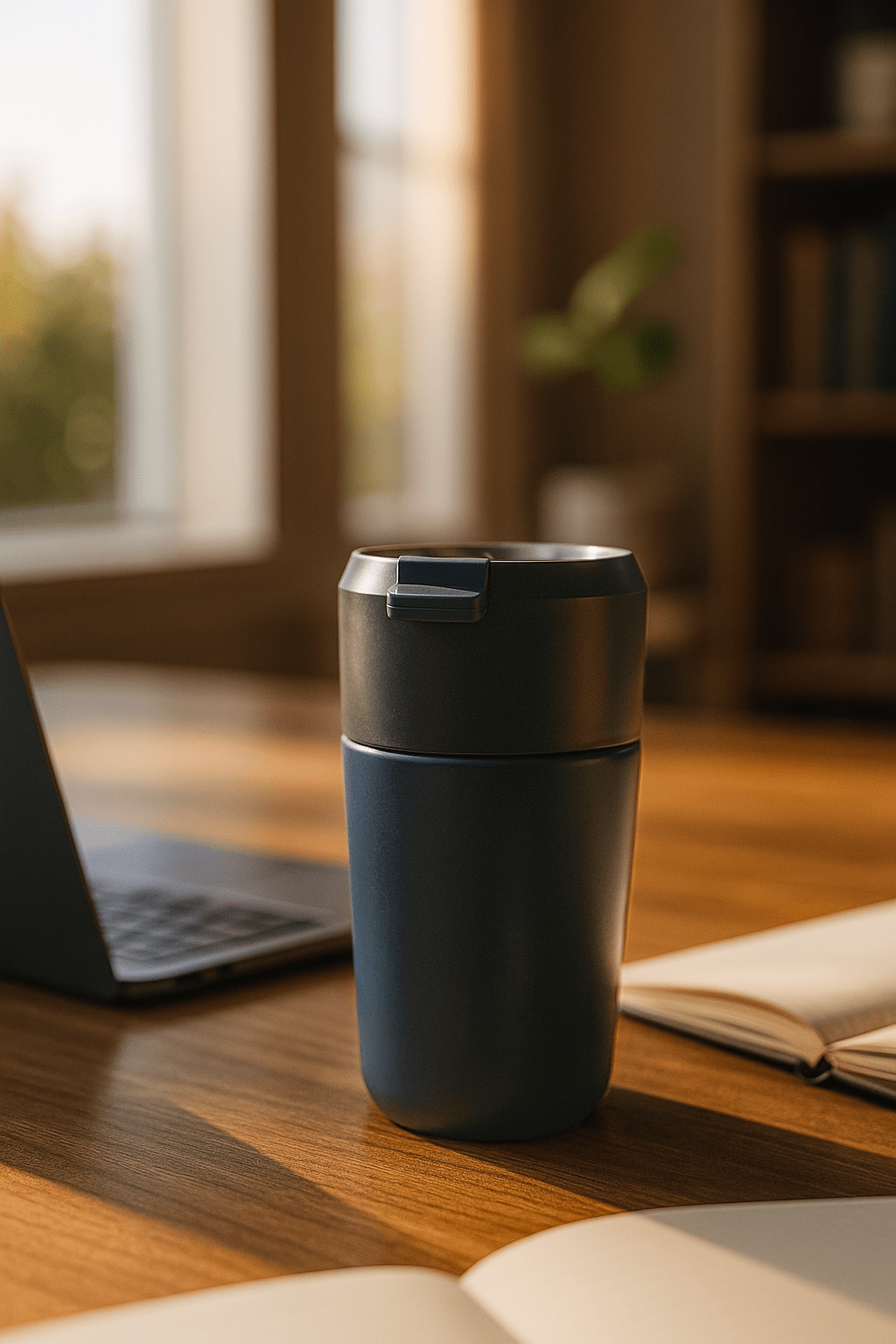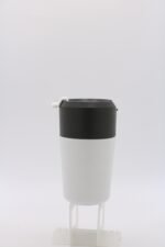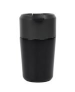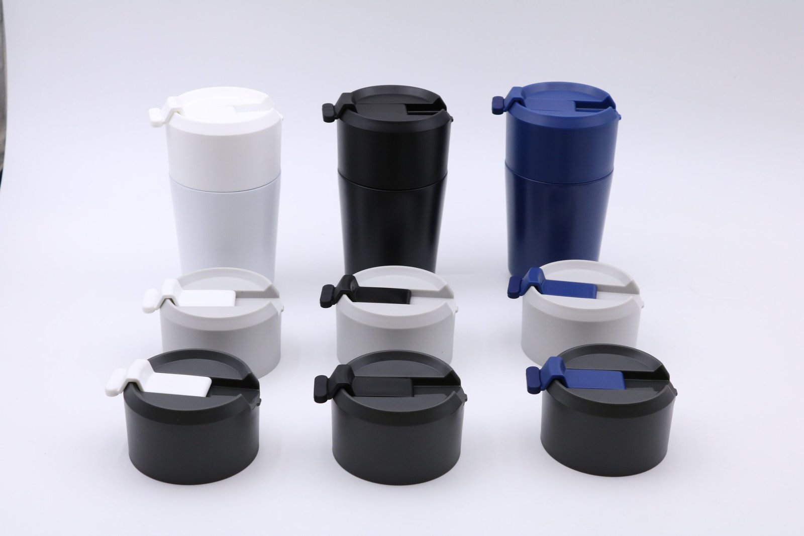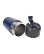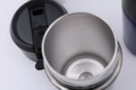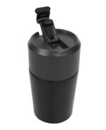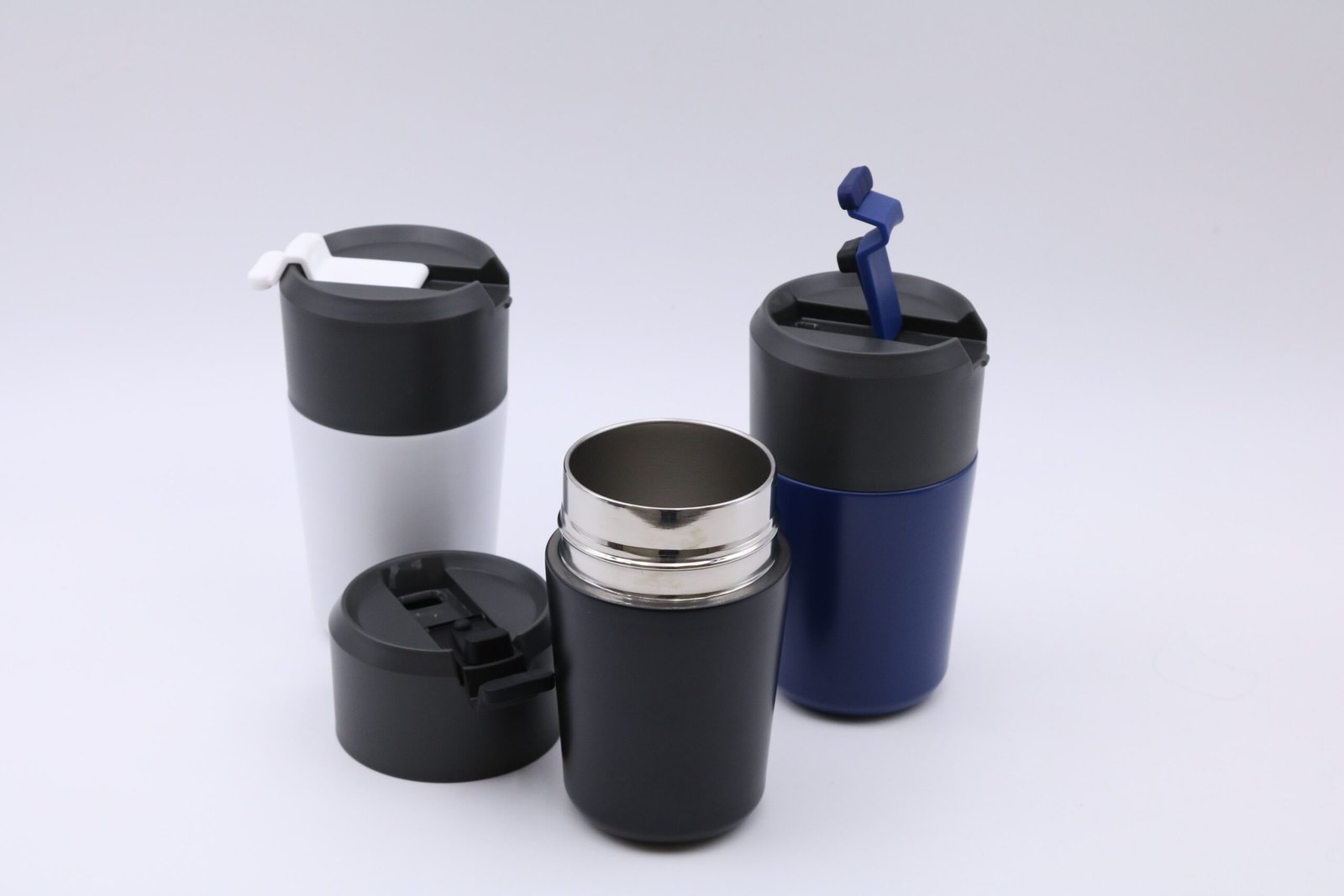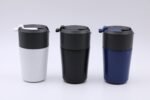 A tumbler made from stainless steel with lid featuring a food grade silicon ring making it leak-proof. It is double walled with a vacuum funtion to maintain temperature.