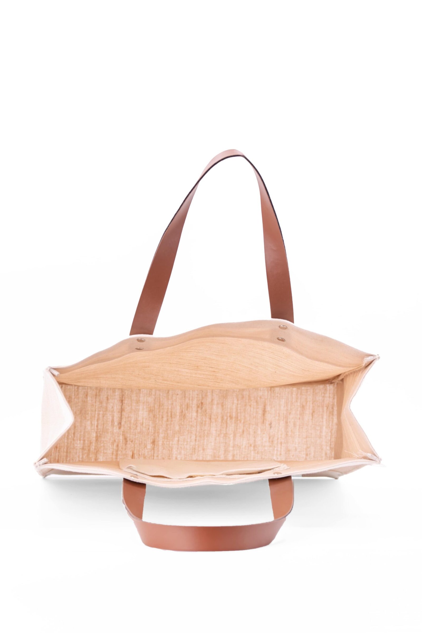 Fabric laminated natural juco tote bag with brown pu leather with inside pocket. Product Size: 40x36x12.5CM.