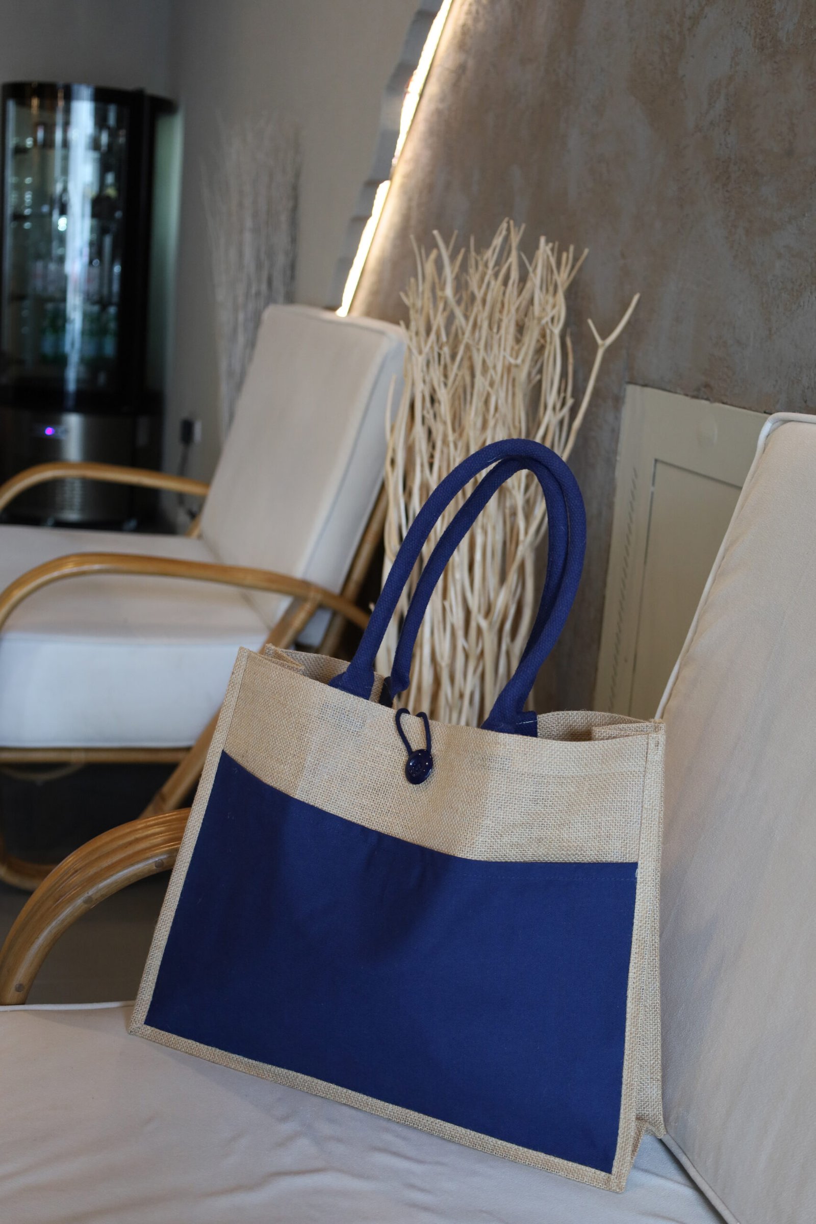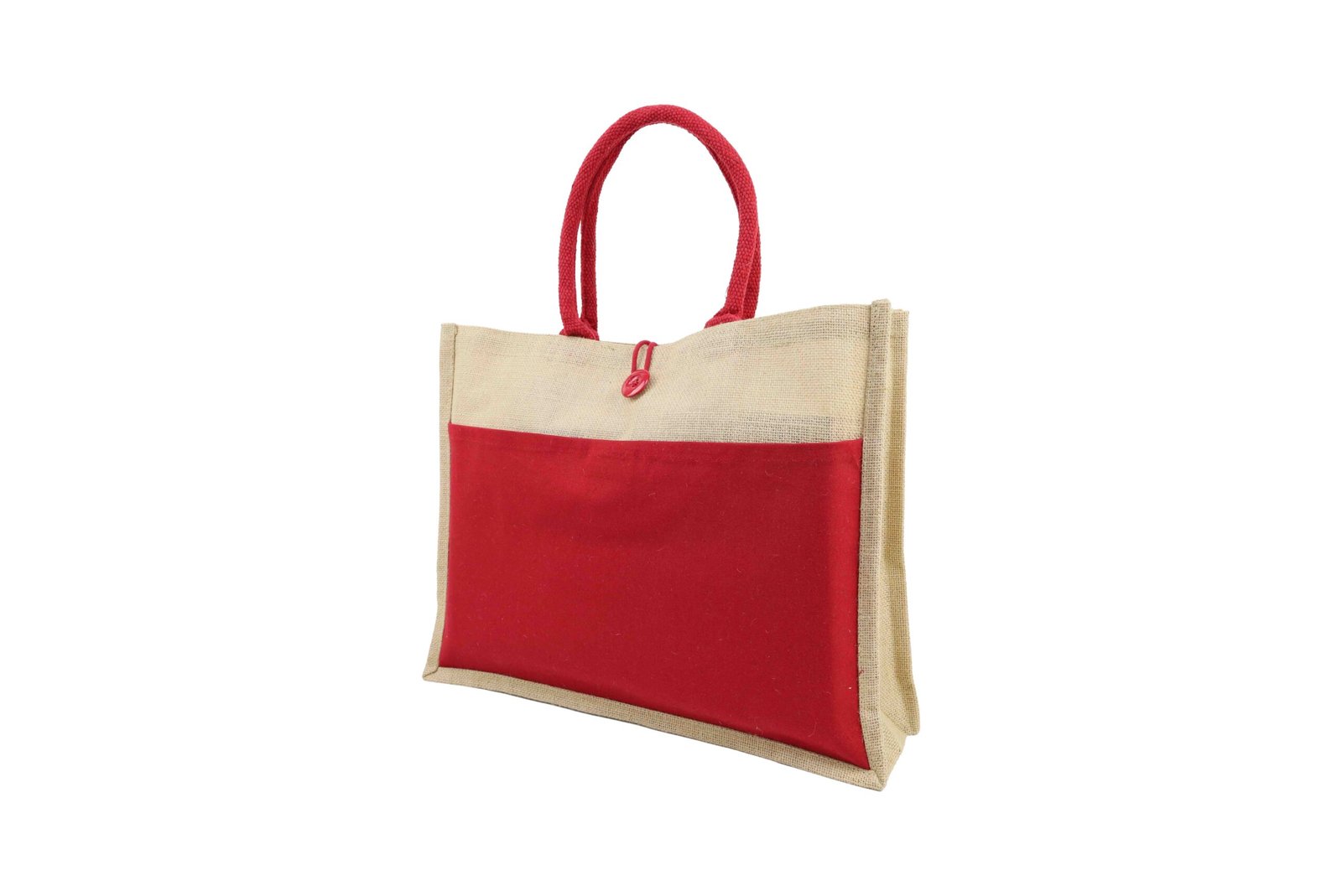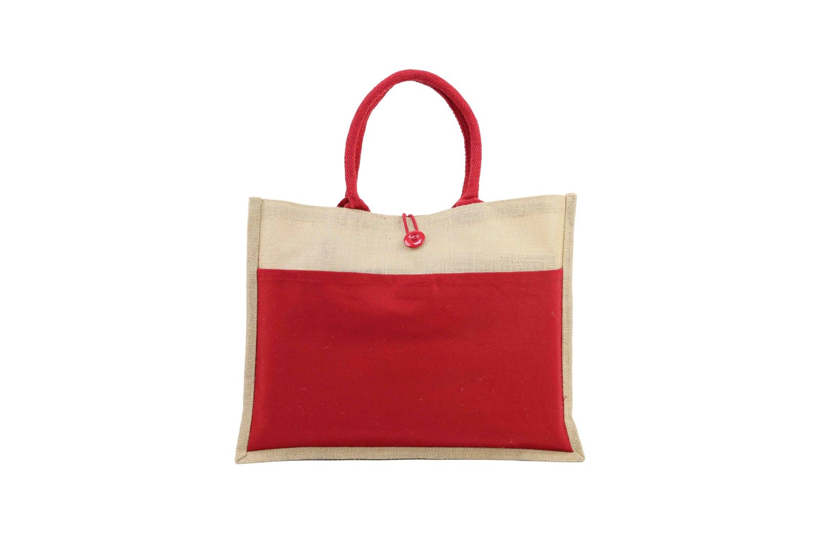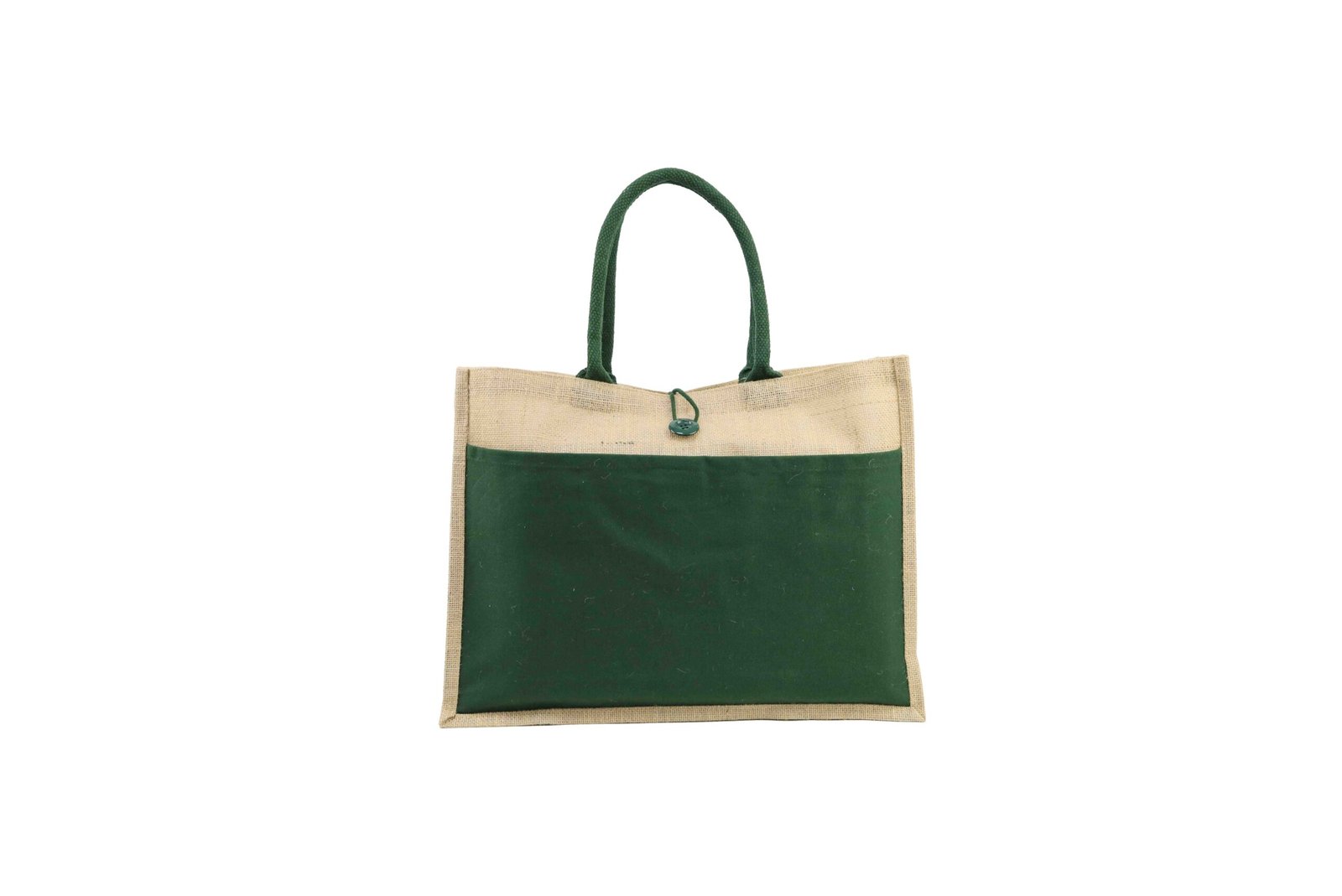 A multi-purpose, eco-friendly jute bag featuring a canvas pocket & cotton webbed handles.