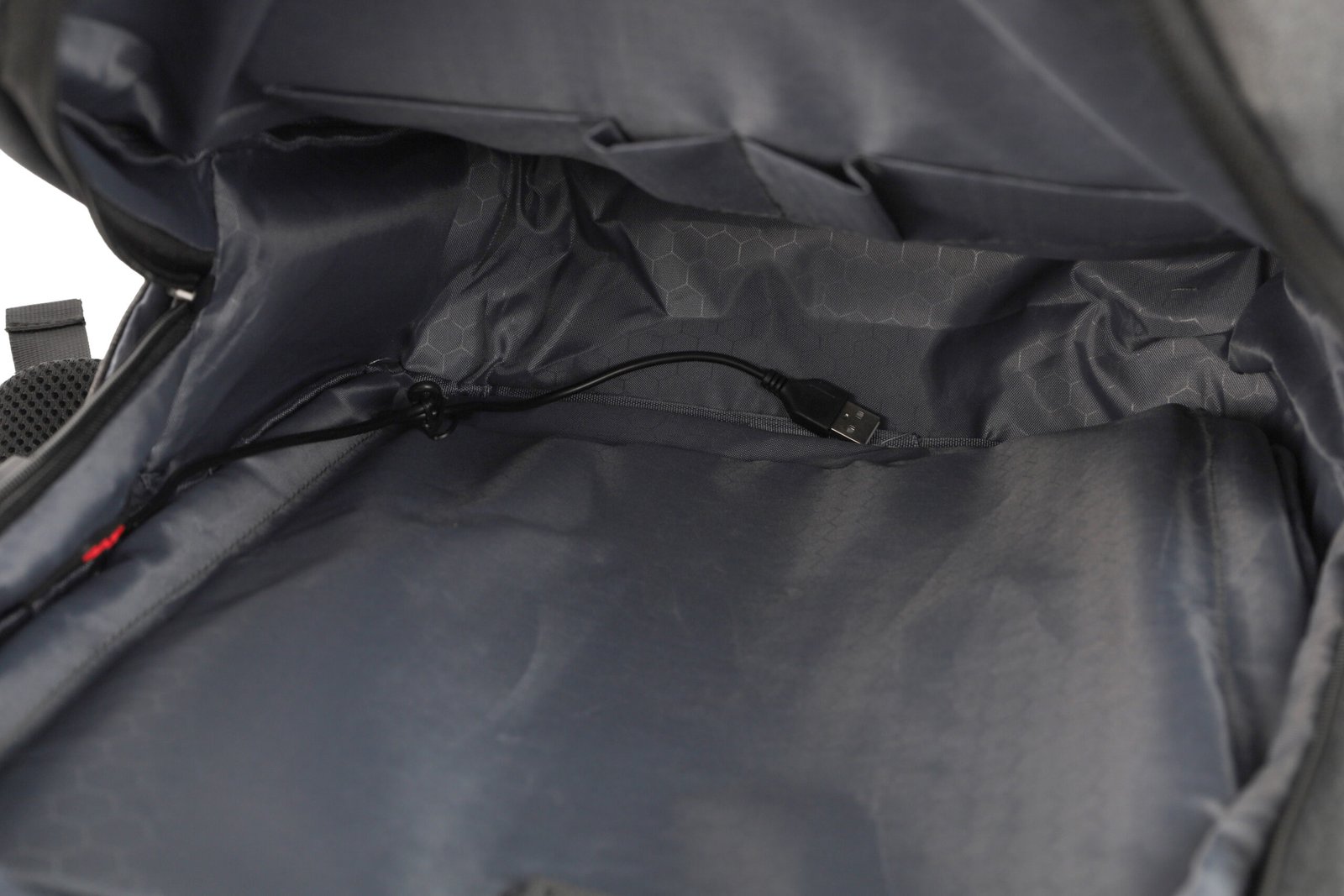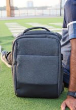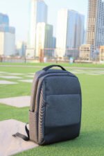 A backpack made from 900D waterproof material and leather detailing. It comes with a USB port and bottle holder on both sides.