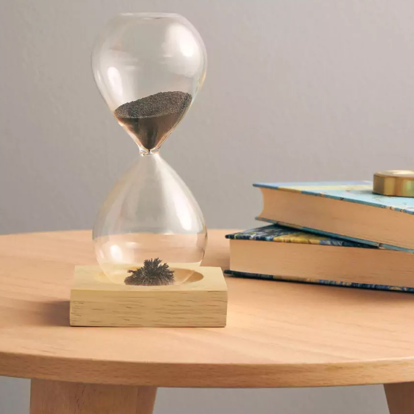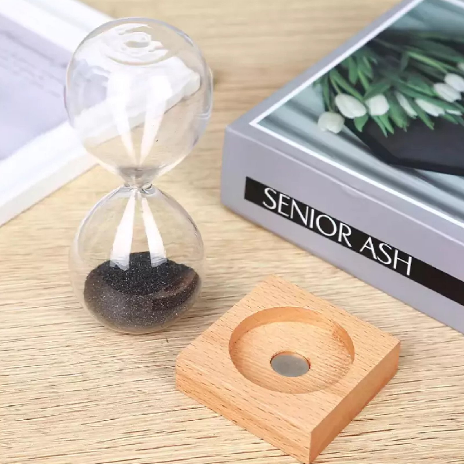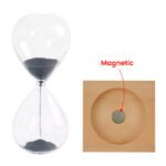 A magnetic sand timer with a wooden base is a unique and visually striking timepiece! It typically consists of a glass container filled with fine iron filings and sand.