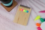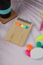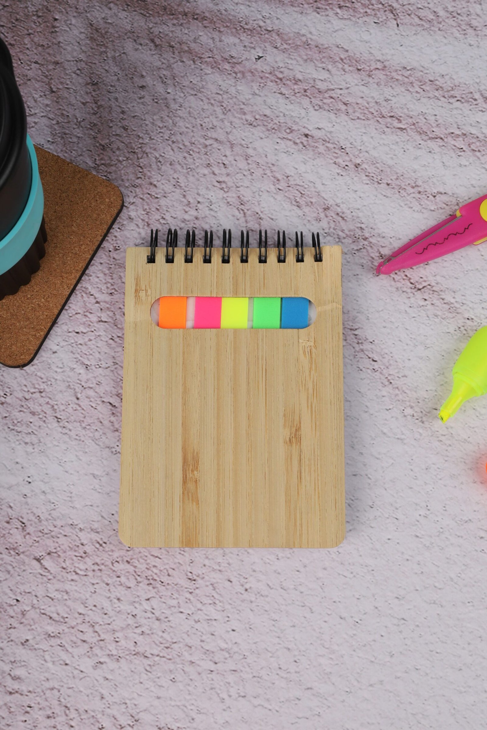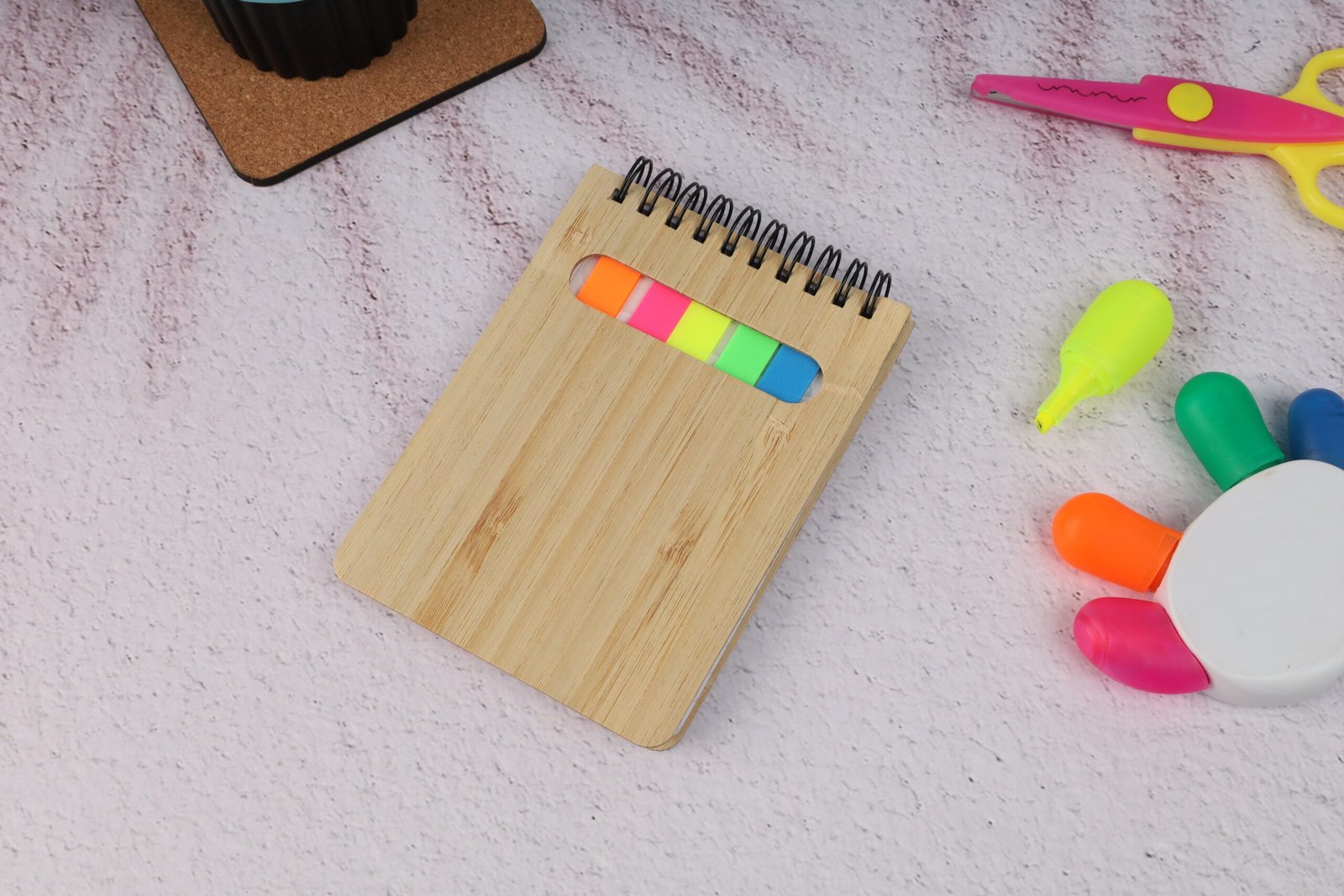 Mini notebook made from bamboo material consisting of 60 sheets. It comes with 5 colour sticky notes and 5 x 7.5 yellow notepad inside.