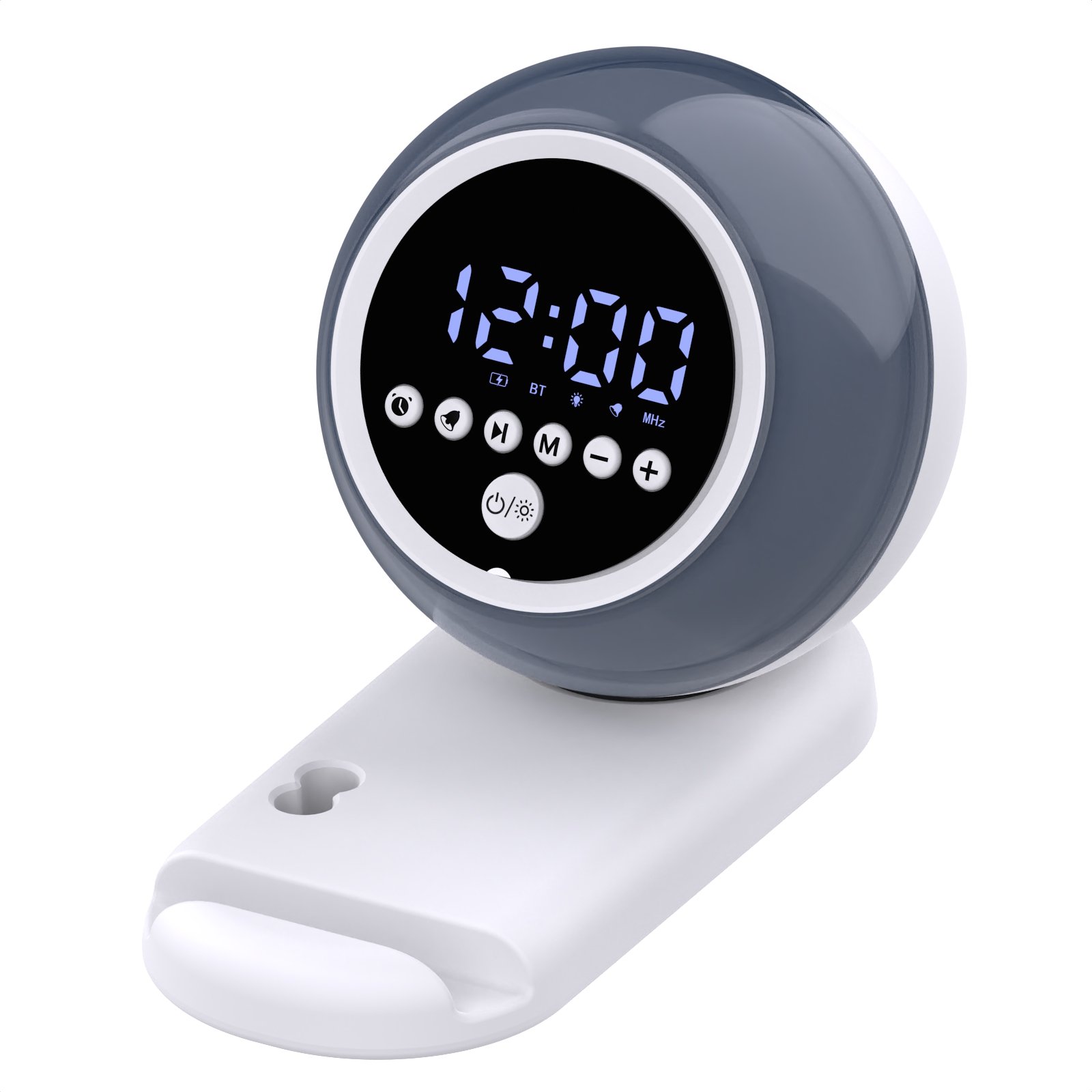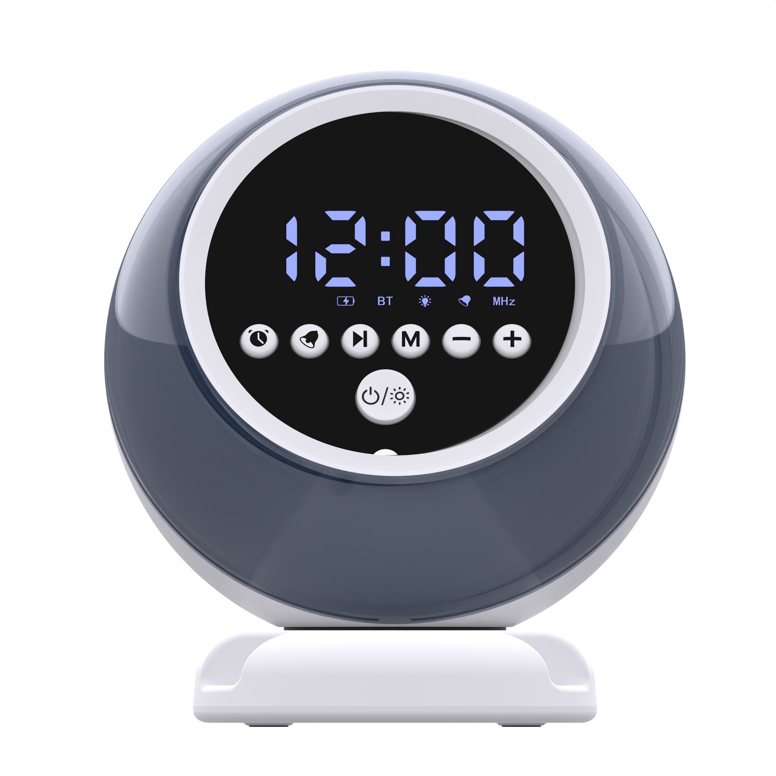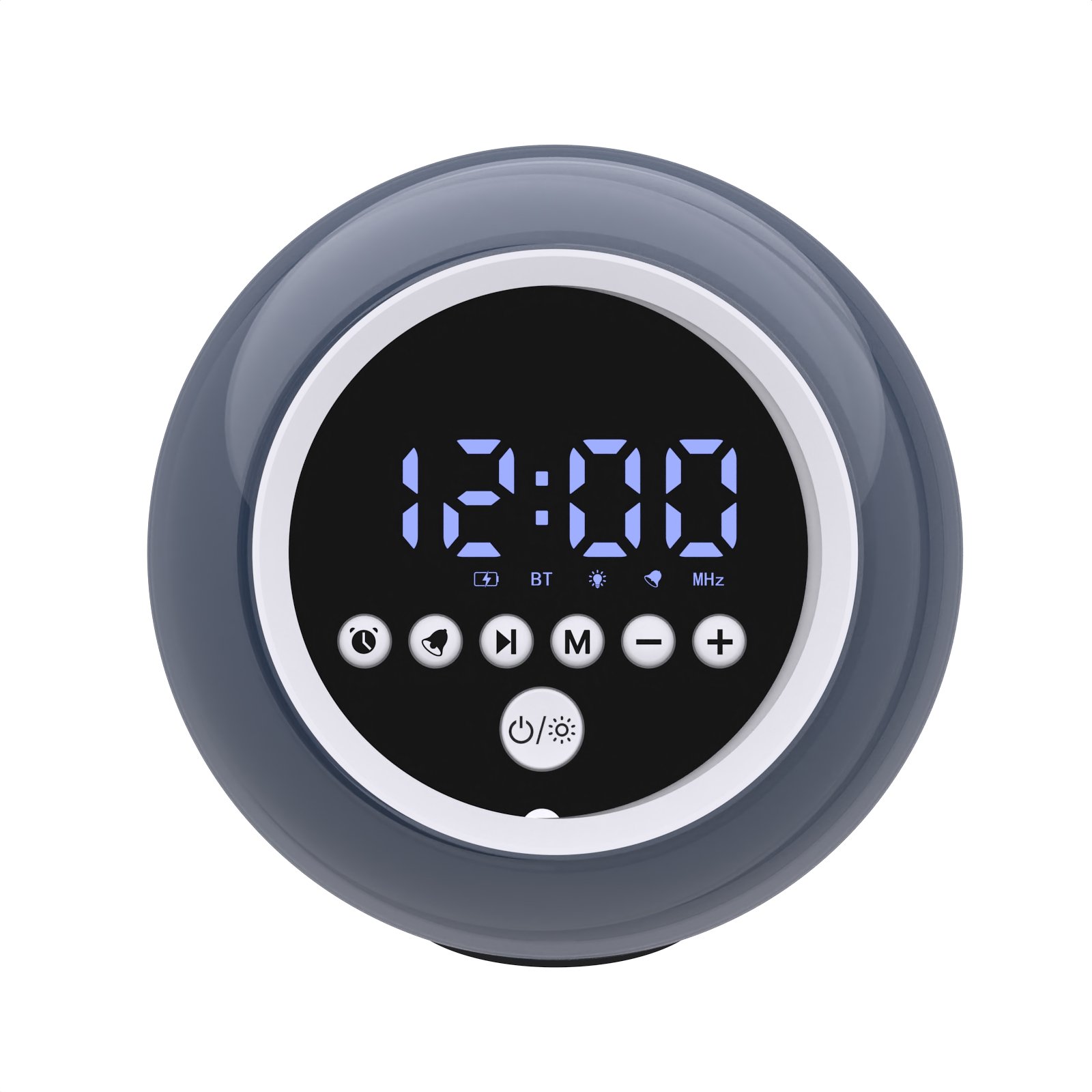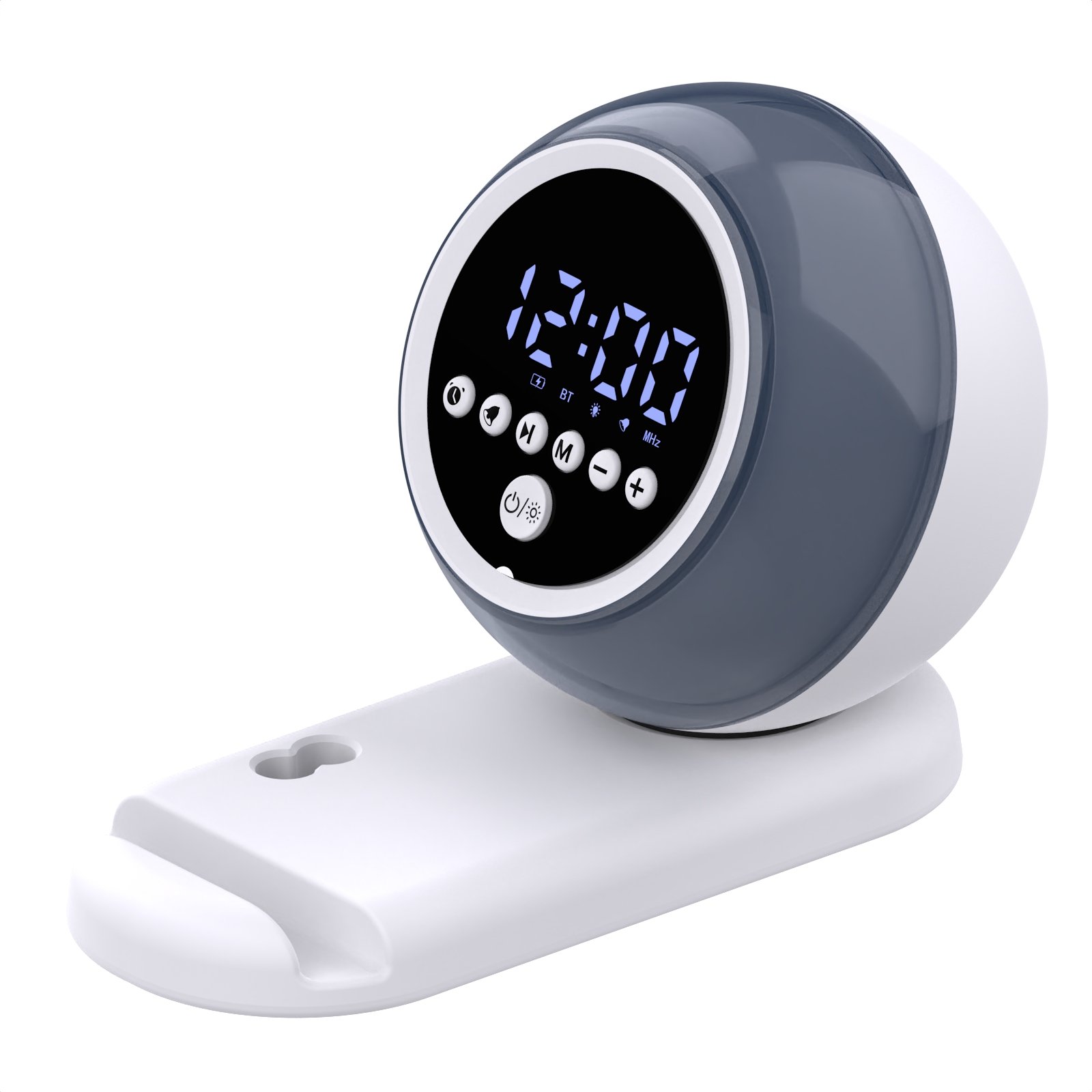 Multifunctional Bluetooth Speaker with RGB Light. Compact and stylish, LUNA is more than a Bluetooth speaker. With JL 5.3 chip for stable connection, it also functions as an alarm clock, pen holder, phone stand, and features ambient RGB lighting. Product Size: Speaker: 11.5cm Dia, Base: 17.6×7.8×1.7cm. Packaging: Paper Box