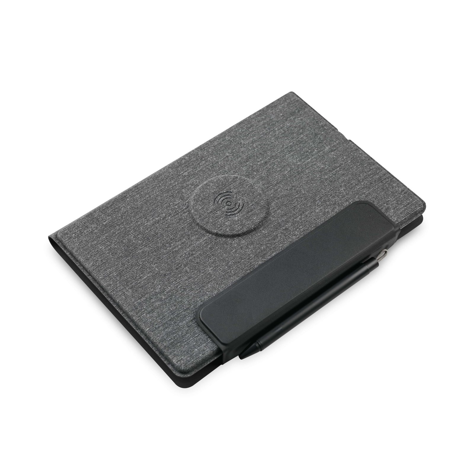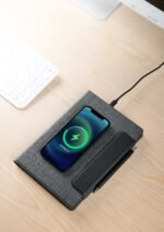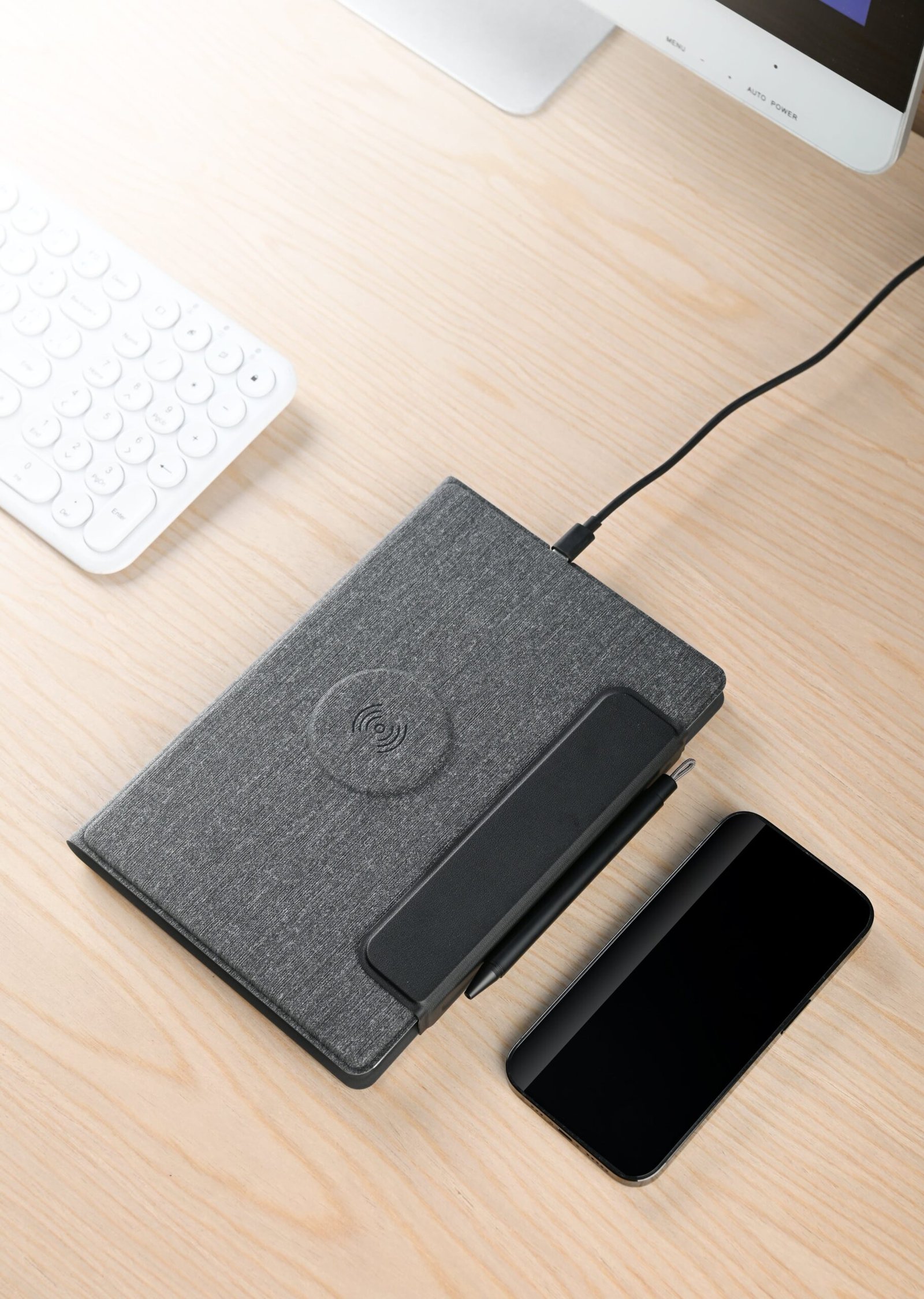 5W magnetic Wireless charger flap 80 sheets notebook in recycled PU-RCS material. Has a magnetic pen paired to this notebook. Product Size: 22.5×15.8×2.3cm. Packaging: Kraft Paper Box