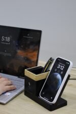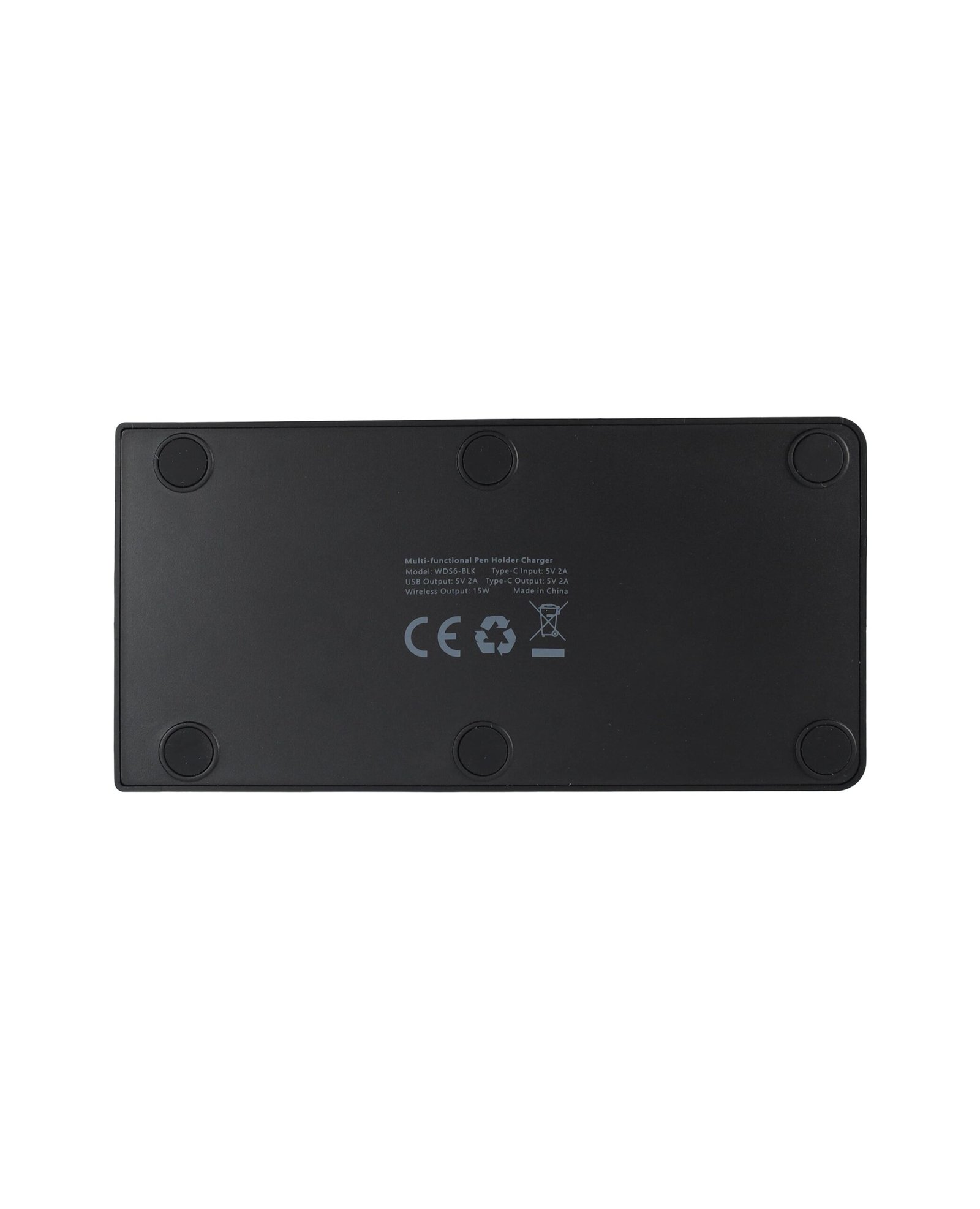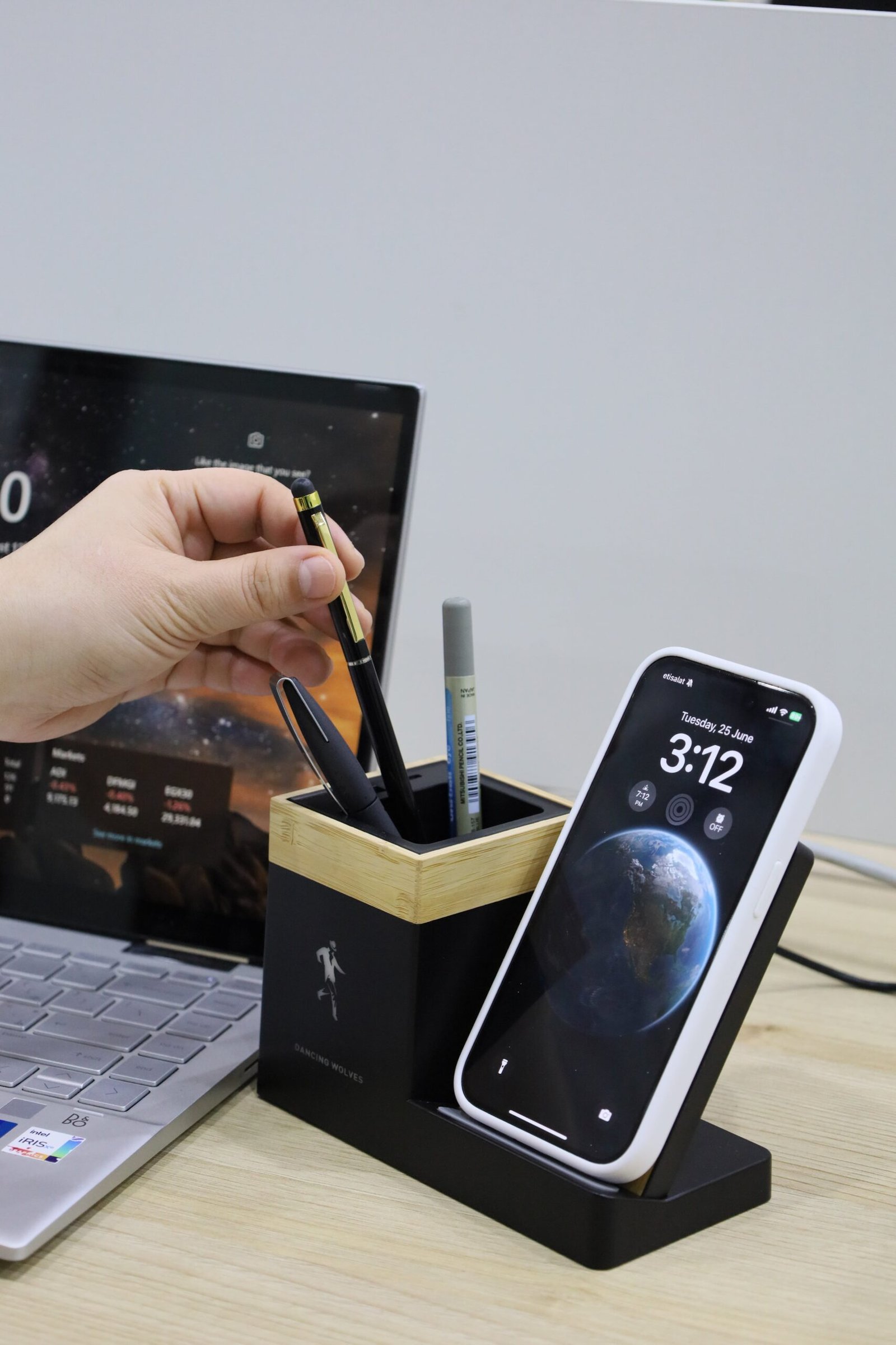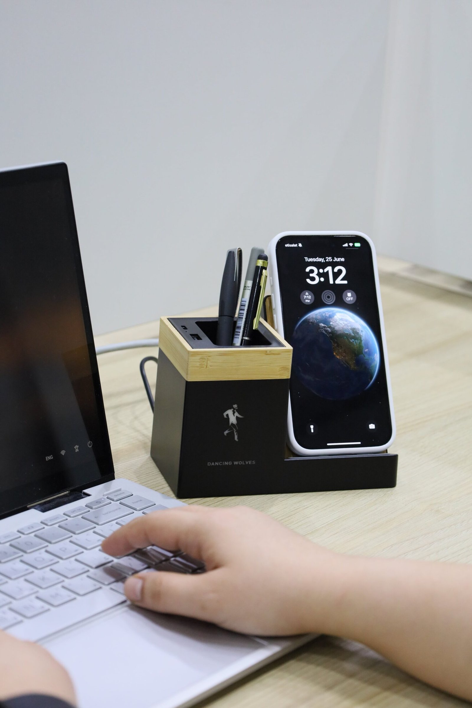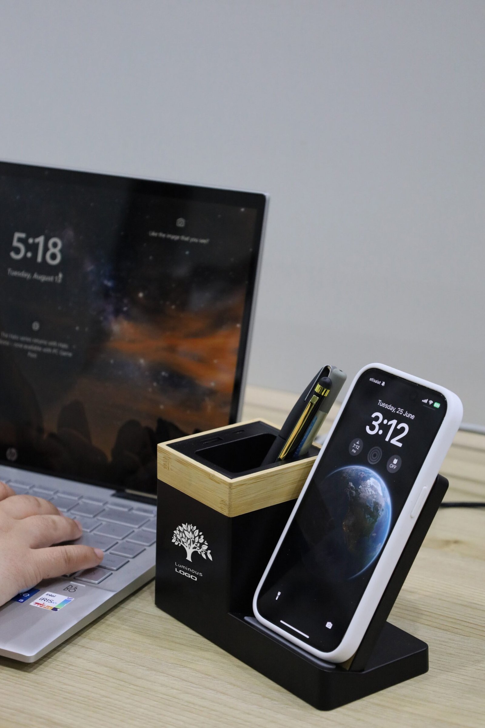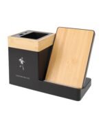 A multi-function pen stand with wireless charging and manual charging features. Made from bamboo & black ABS and has a white LED panel.