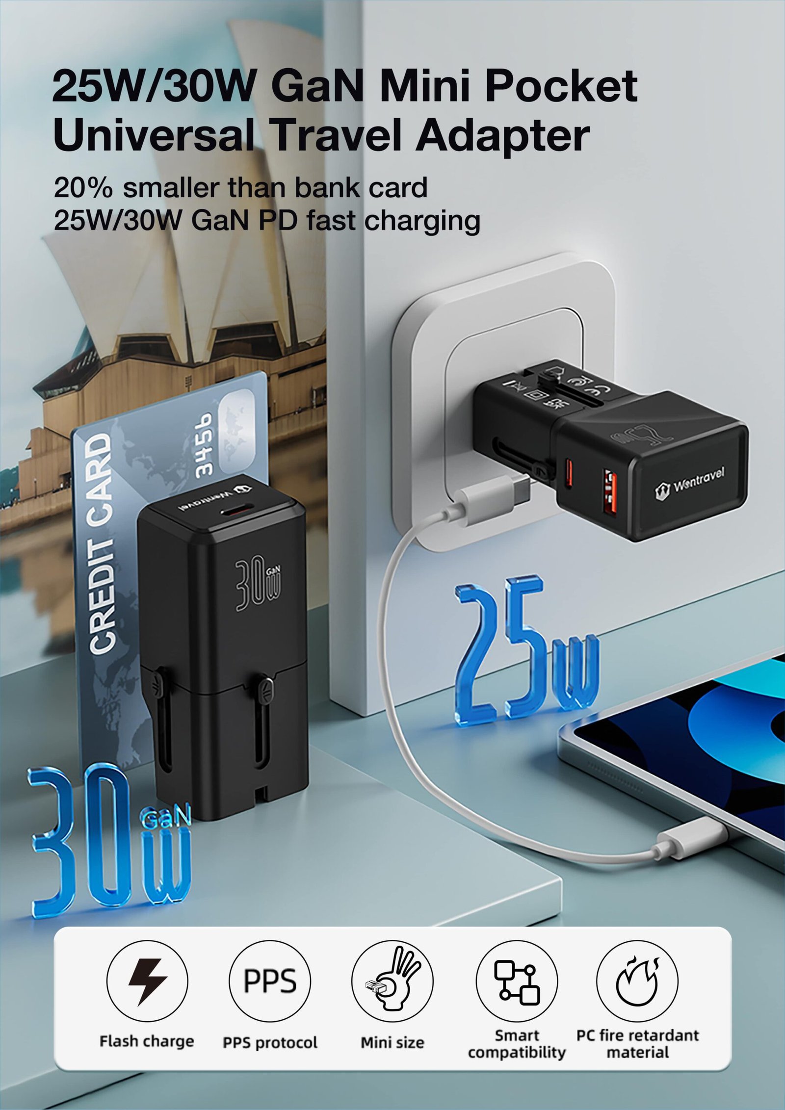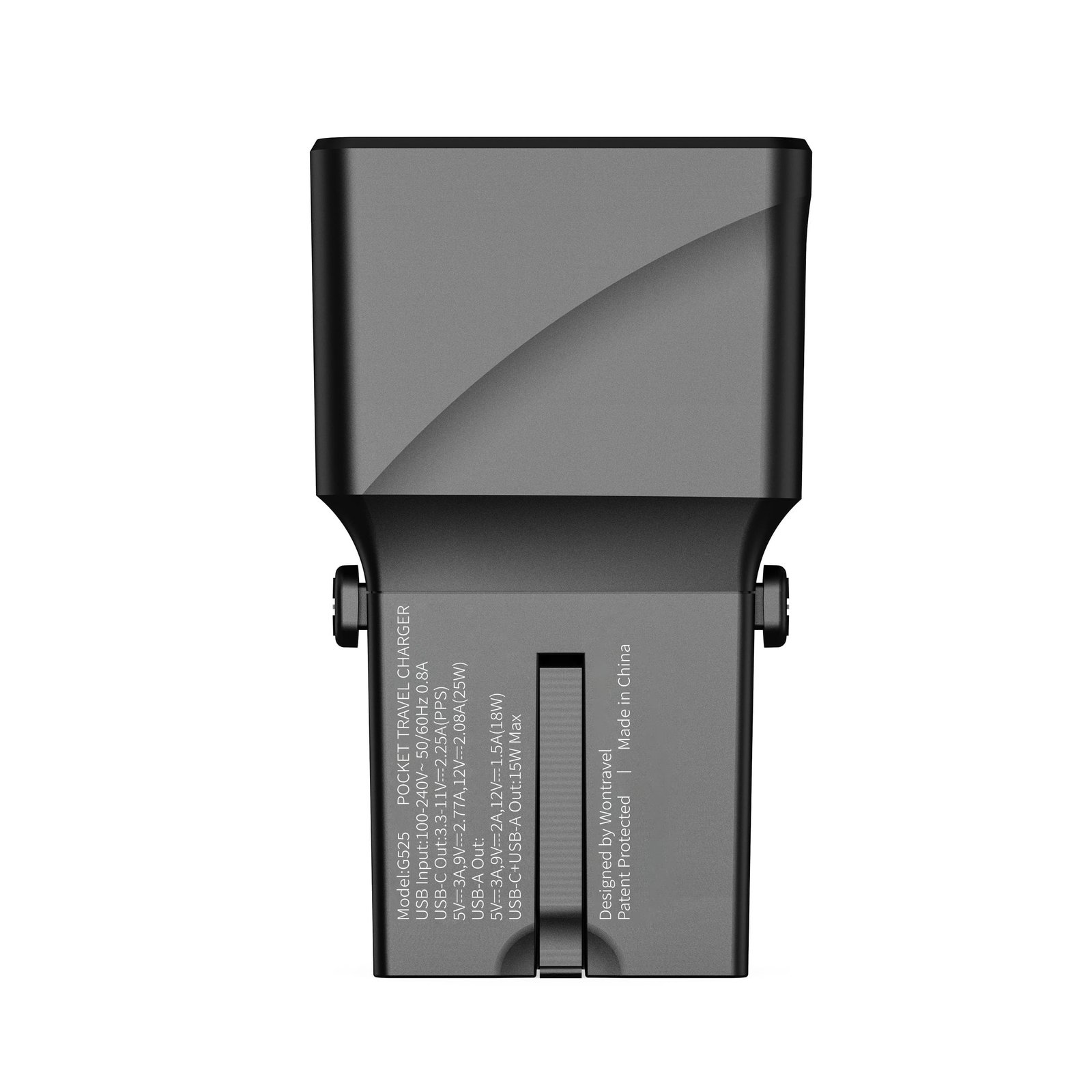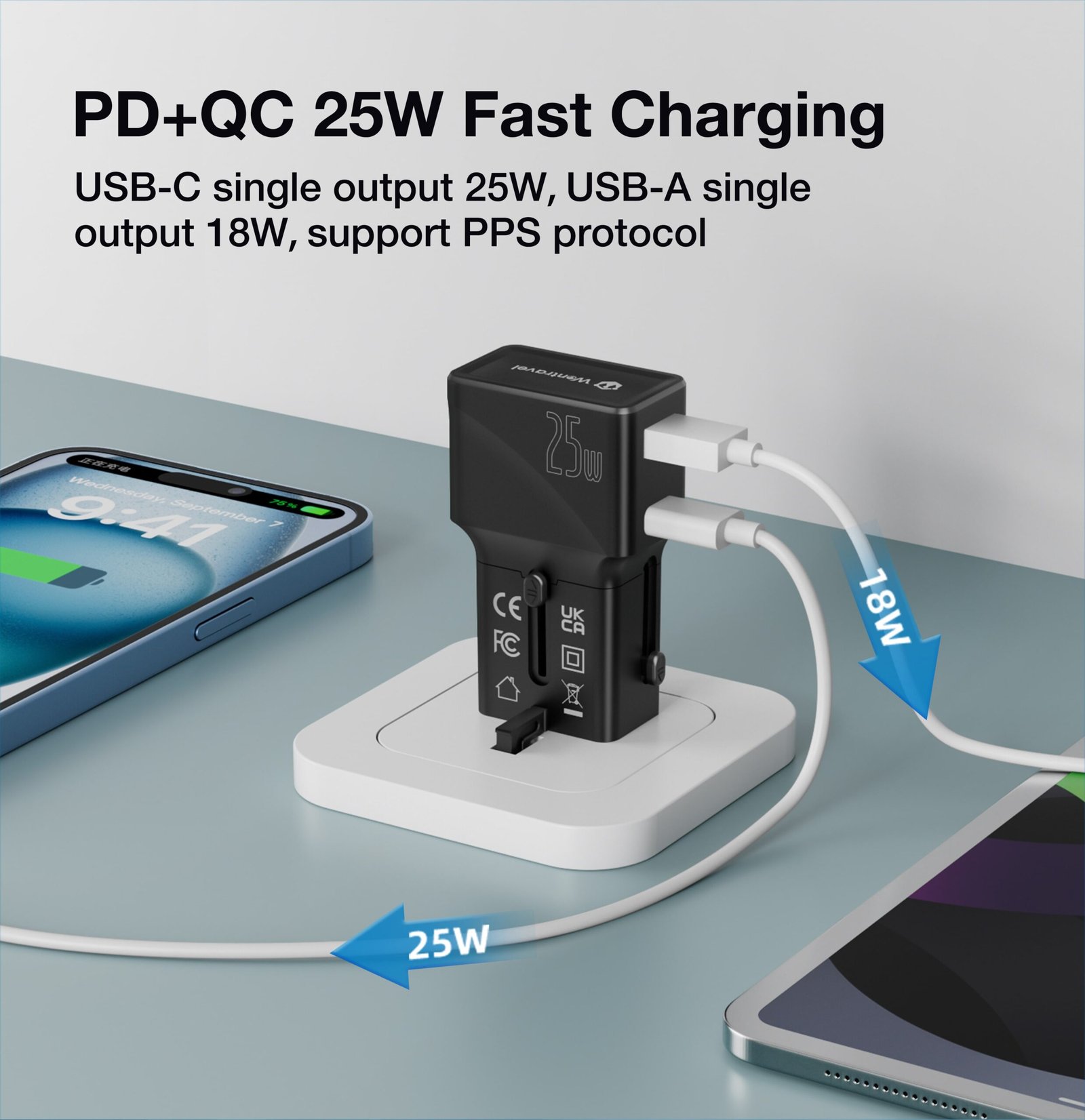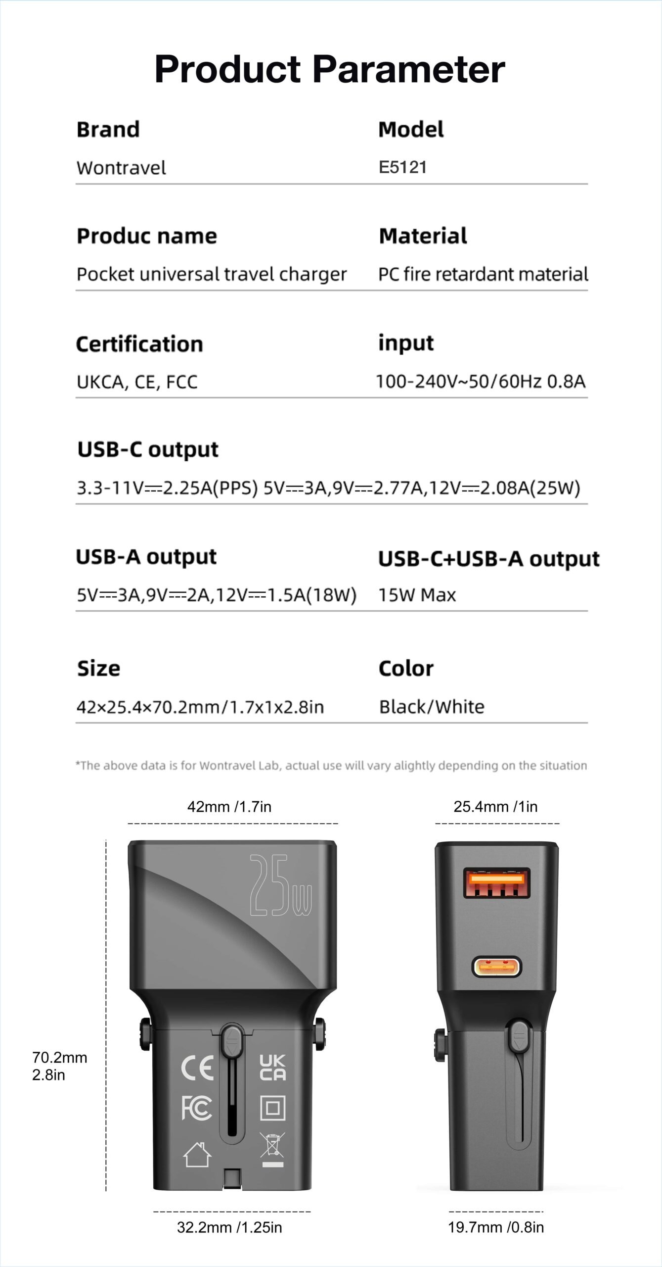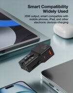 Compact and powerful, this 25W mini travel charger supports PD Quick Charge and QC3.0. Features dual ports (USB-C & USB-A), intelligent power distribution up to 15W combined. Universal voltage (100–240V), multi-region plugs (US/UK/AUS/EU), and safety-certified with CE/FCC/UKCA. Made from high-quality fire-retardant PC. Weight: 63.6g. Product Size: 4.1x7x2.5cm. Packaging: Paper Box