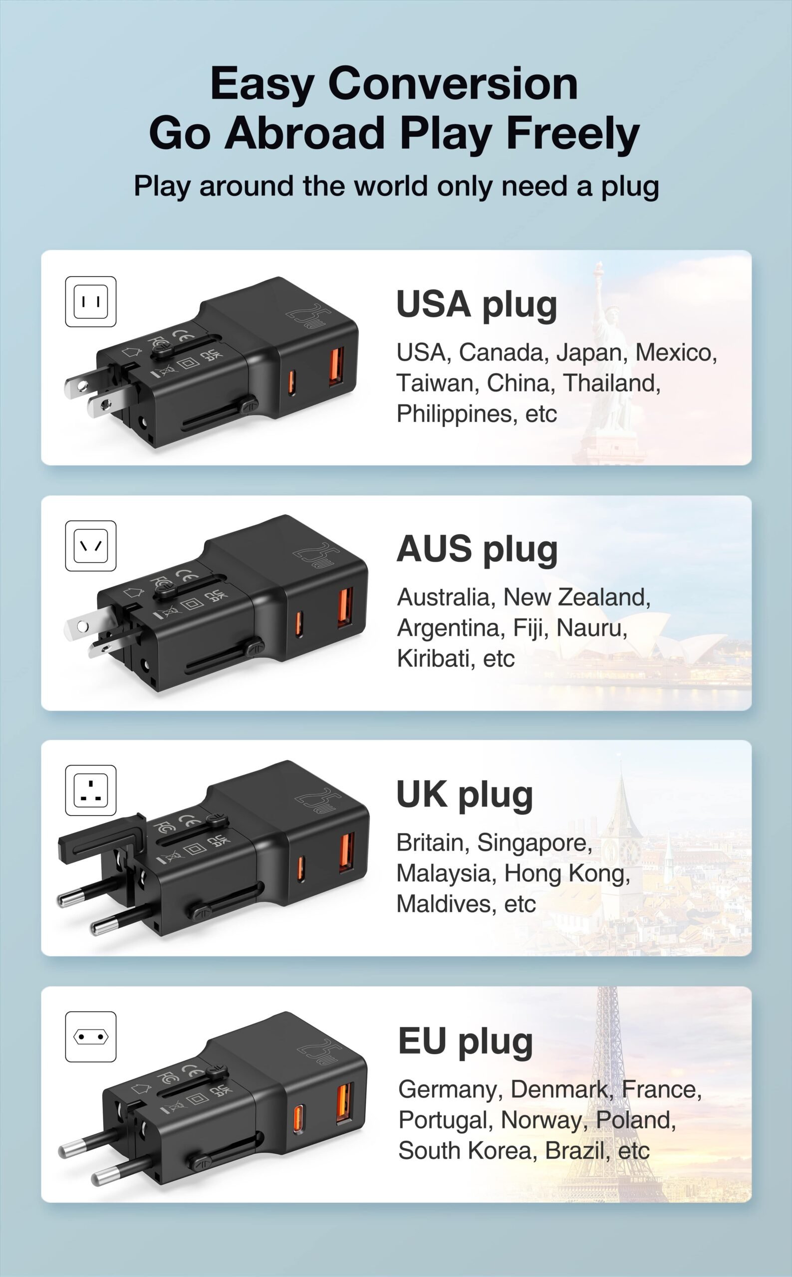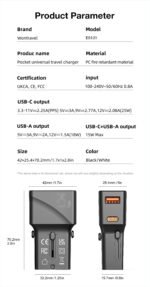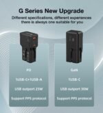 Built with universal voltage compatibility (100–240V) and equipped with multi-region plug options (US/UK/AUS/EU), this charger is optimized for global travelers. Made from high-quality, fire-retardant PC material, it ensures durability and safety, certified by CE, FCC, and UKCA standards.