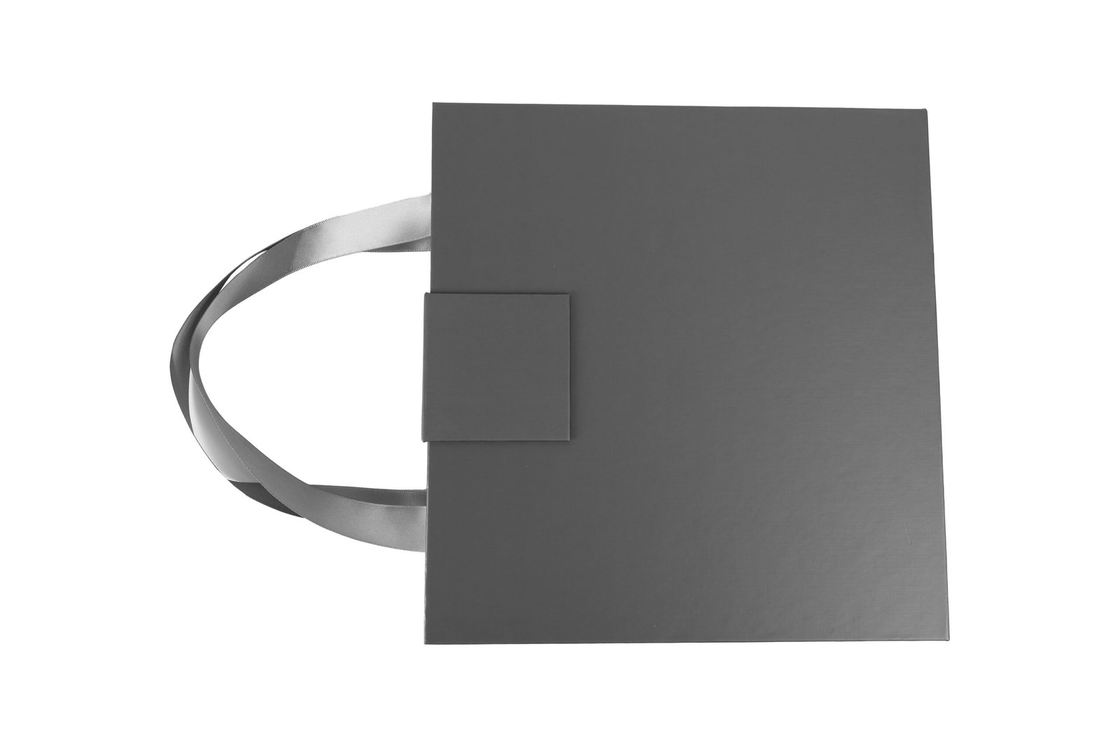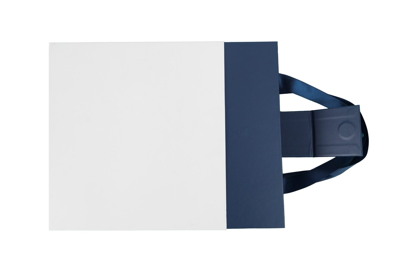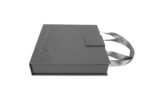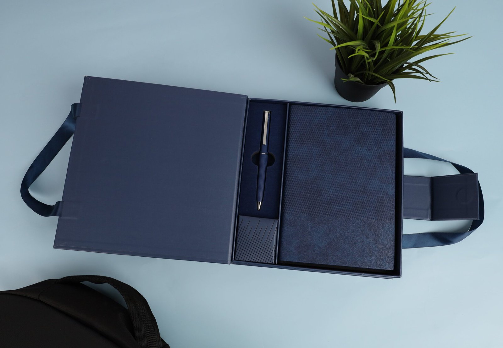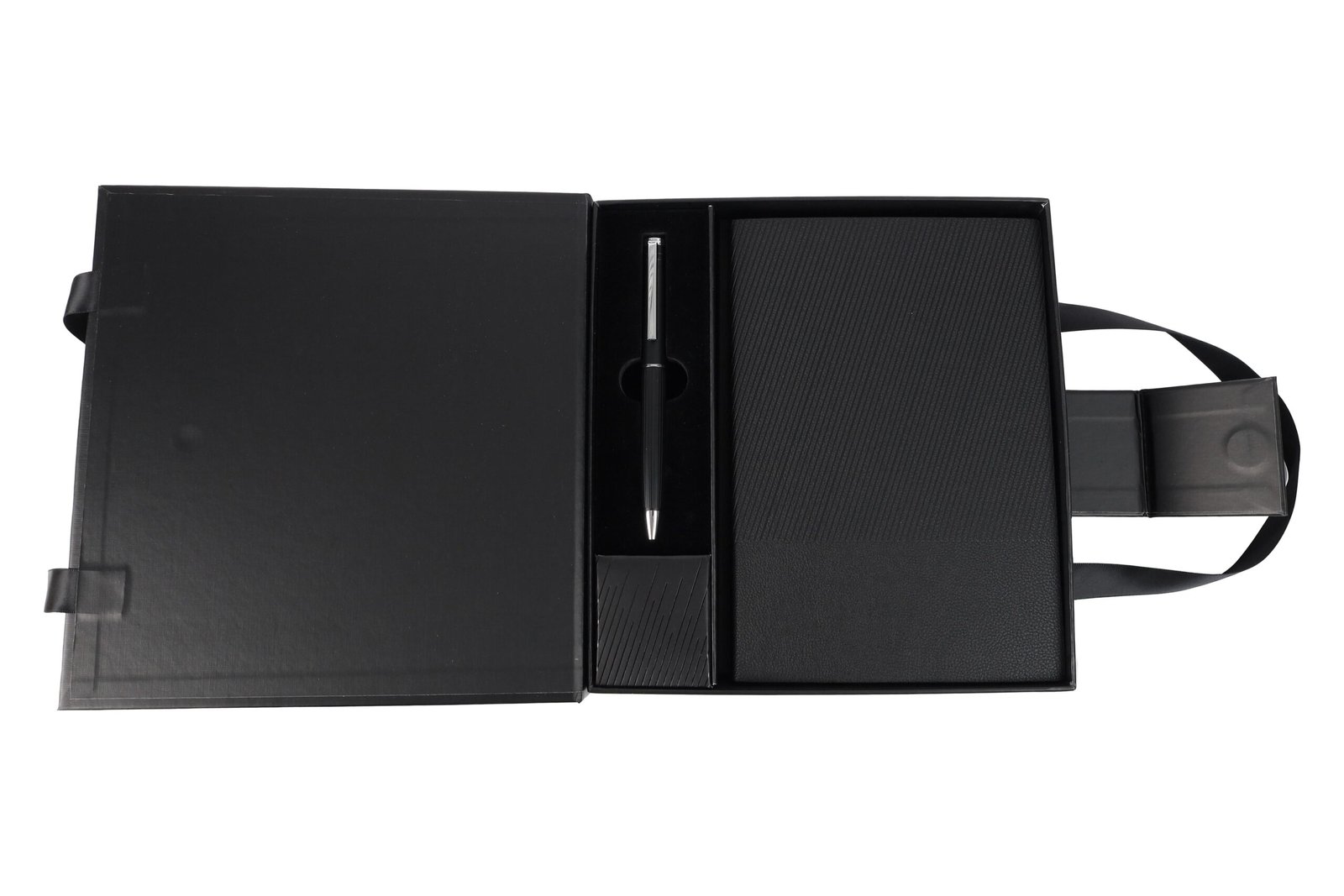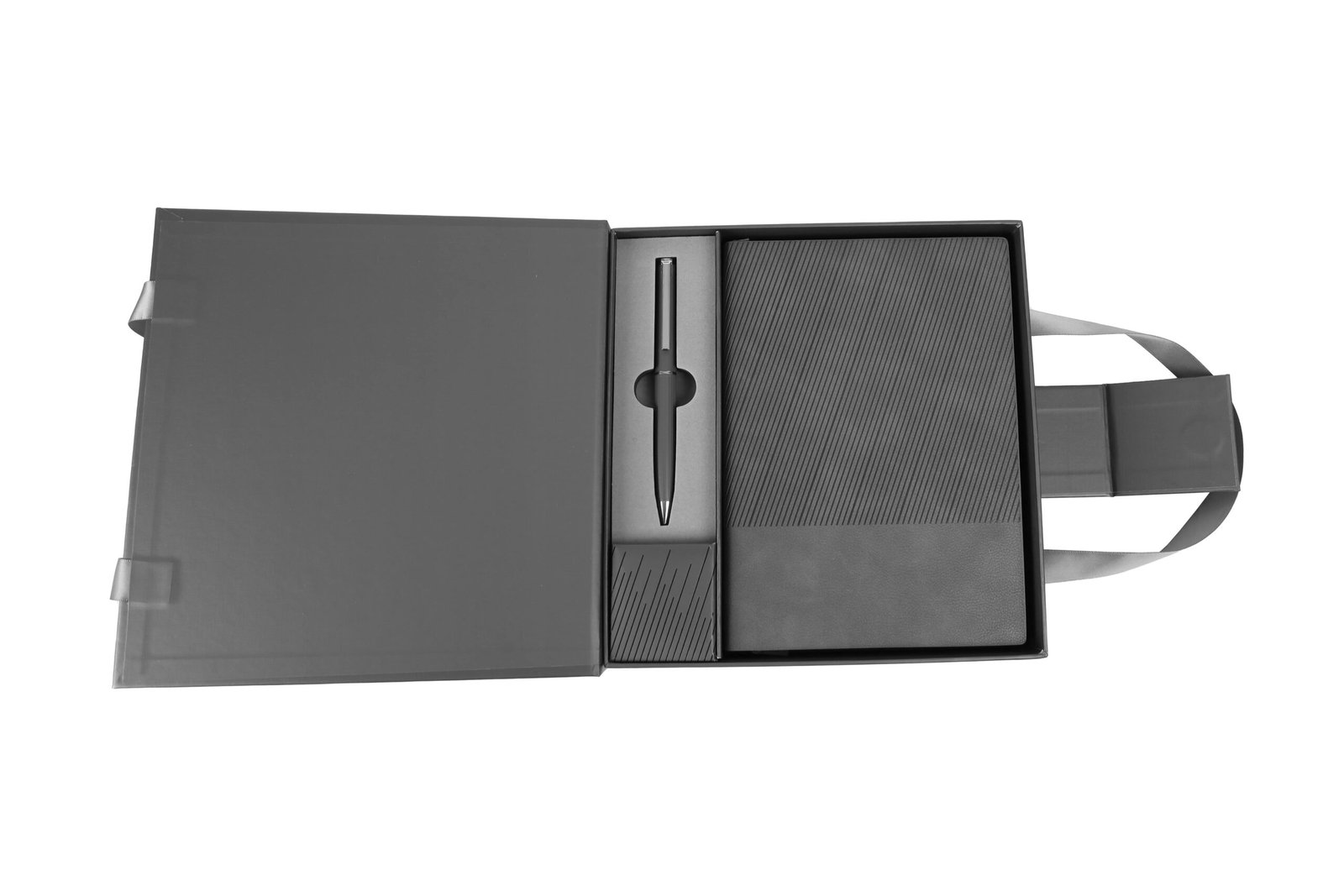 A large corporate gift box made from a kappa board with a 2.5 mm thickness, it features a magnetic closing and a handle. The gift box consists of a notebook that has 80 sheets of 100 GSM paper and a metal pen matching the colour of the box.