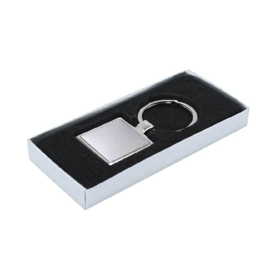 A keychain that is square and finished in shiny chrome. Can be branded on one side.