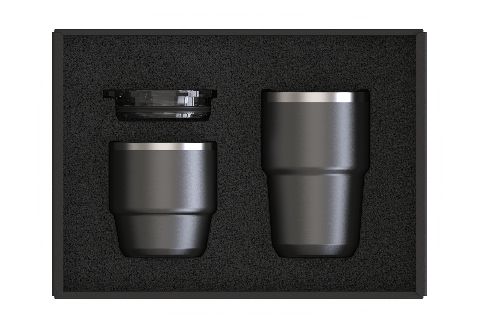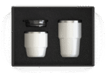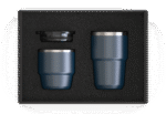 STACKABLE COFFEE SET. This set includes two recycled stainless steel coffee cups, featuring capacities of 180ml and 240ml, making them ideal for all your drinking moods, whether you prefer a small espresso or a larger coffee.Crafted with a 304 stainless steel interior for superior quality and a 201 stainless steel exterior for durability, these mugs are designed to withstand daily use while being environmentally friendly. The set comes with a single lid that fits both mugs, ensuring your beverages stay secure and spill-free while on the go.The stackable design allows for easy storage, making it convenient for home use or travel. Packaged in an elegant black kraft box, the STACKABLE COFFEE SET is not only practical but also makes a thoughtful gift for coffee lovers, eco-conscious consumers, or anyone who enjoys stylish drinkware.