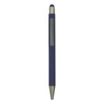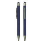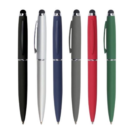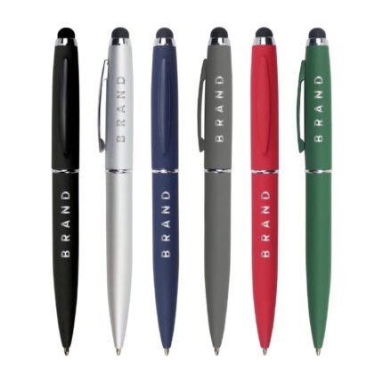 A metal pen that comes with a stylus and a matte finish and with a chrome finish on the inside.