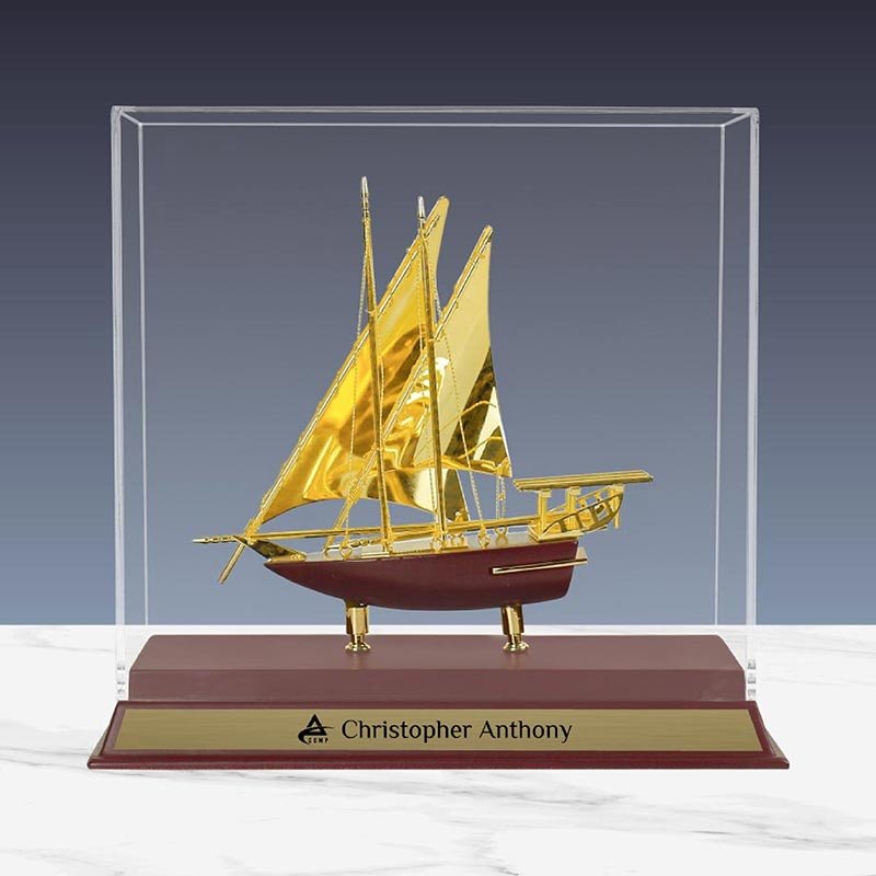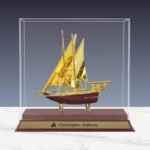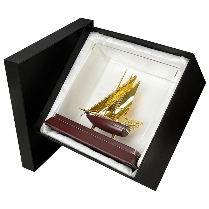 The memento often features a dhow crafted from high-quality materials, such as gold or gold-plated metal, showcasing intricate details that highlight the craftsmanship of traditional dhow-building techniques.